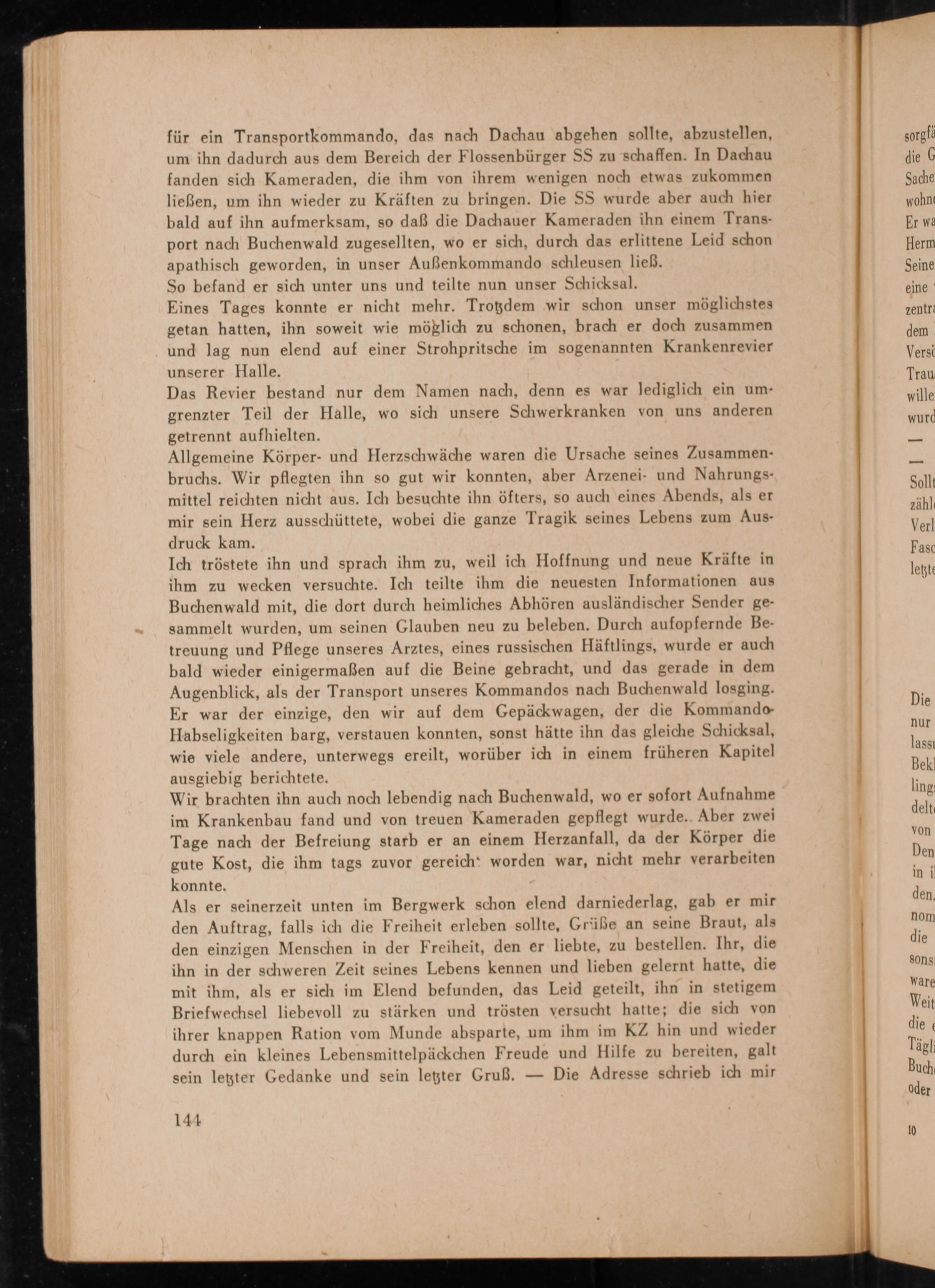 für ein Transportkommando, das nach Dachau abgehen sollte, abzustellen, um ihn dadurch aus dem Bereich der Flossenbürger SS zu schaffen. In Dachau fanden sich Kameraden, die ihm von ihrem wenigen noch etwas zukommen ließen, um ihn wieder zu Kräften zu bringen. Die SS wurde aber auch hier bald auf ihn aufmerksam, so daß die Dachauer Kameraden ihn einem Transport nach Buchenwald zugesellten, wo er sich, durch das erlittene Leid schon apathisch geworden, in unser Außenkommando schleusen ließ. So befand er sich unter uns und teilte nun unser Schicksal. Eines Tages konnte er nicht mehr. Trotzdem wir schon unser möglichstes getan hatten, ihn soweit wie möglich zu schonen, brach er doch zusammen und lag nun elend auf einer Strohpritsche im sogenannten Krankenrevier unserer Halle.