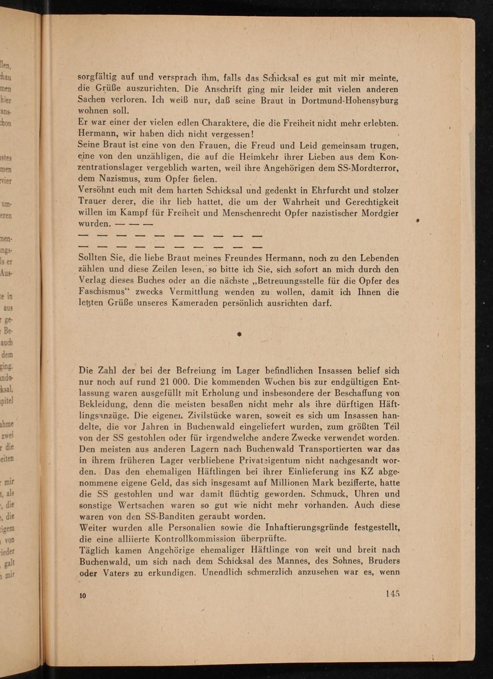 Sollten Sie, die liebe Braut meines Freundes Hermann, noch zu den Lebenden zählen und diese Zeilen lesen, so bitte ich Sie, sich sofort an mich durch den Verlag dieses Buches oder an die nächste„Betreuungsstelle für die Opfer des Faschismus‘ zwecks Vermittlung wenden zu wollen, damit ich Ihnen die legten Grüße unseres Kameraden persönlich ausrichten darf.