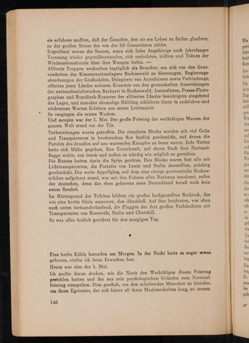 Ich mußte daran denken, wie die Nazis den Werktätigen diesen Feiertag gestohlen hatten und ihn aus rein psychologischen Gründen zum National- feiertag stempelten. Dies geschah, um den arbeitenden Menschen zu blenden, um ihren Egoismus, der sich hinter all ihren Machenschaften barg, zu tarnen.