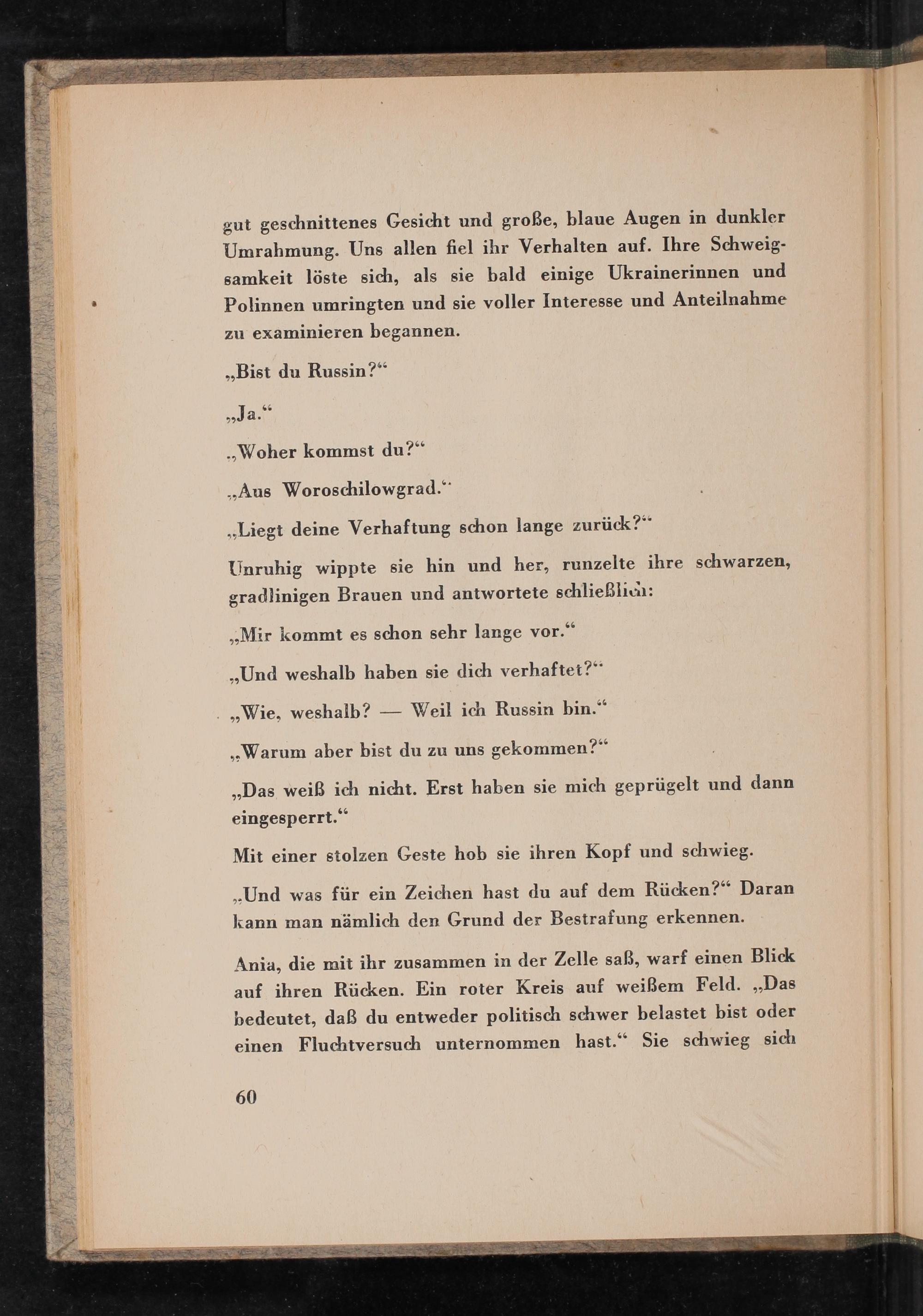Ania, die mit ihr zusammen in der Zelle saß, warf einen Blick auf ihren Rücken. Ein roter Kreis auf weißem Feld. ,, Das bedeutet, daß du entweder politisch schwer belastet bist oder einen Fluchtversuch unternommen hast." Sie schwieg sich