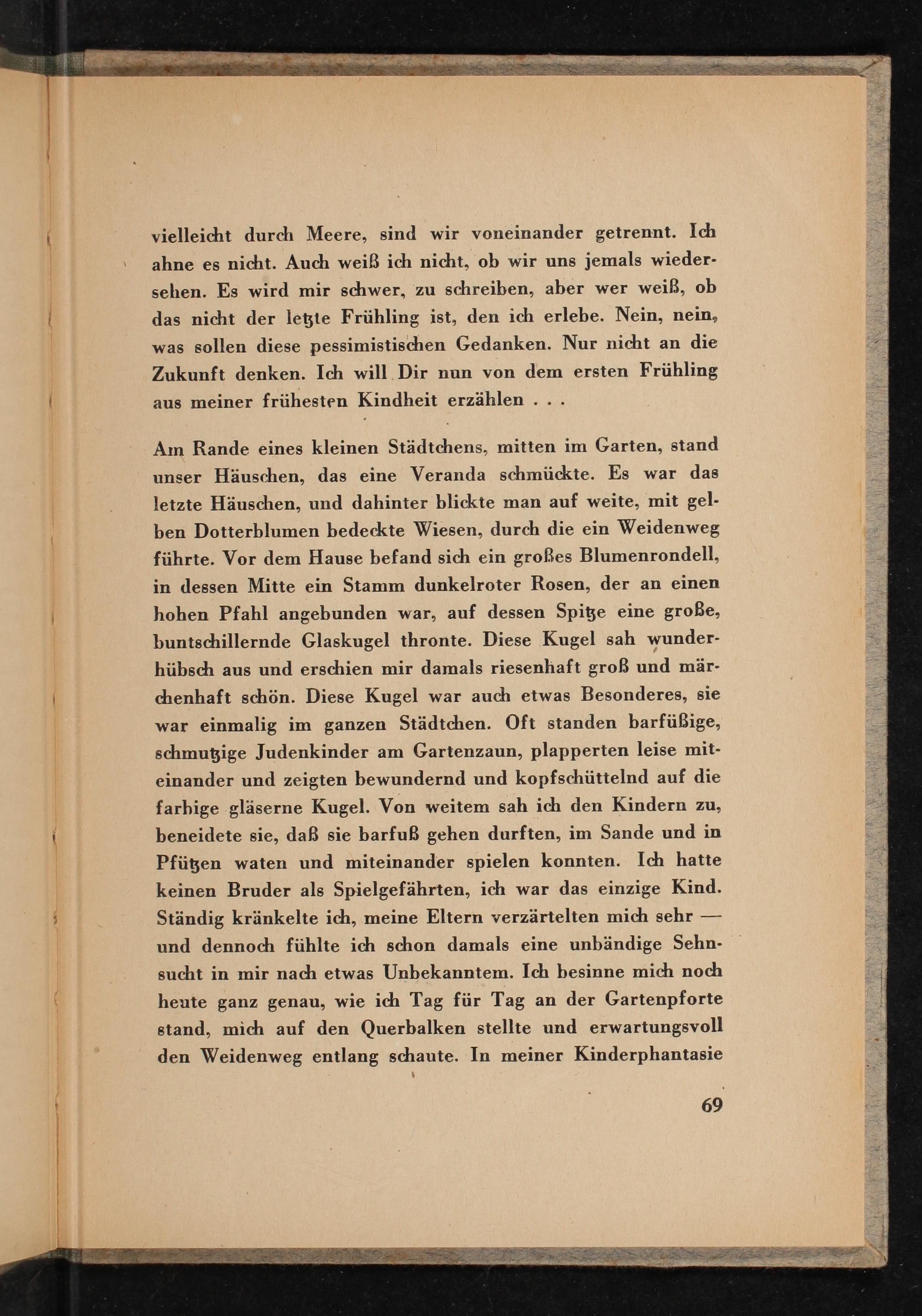 Am Rande eines kleinen Städtchens, mitten im Garten, stand unser Häuschen, das eine Veranda schmückte. Es war das letzte Häuschen, und dahinter blickte man auf weite, mit gelben Dotterblumen bedeckte Wiesen, durch die ein Weidenweg führte. Vor dem Hause befand sich ein großes Blumenrondell, in dessen Mitte ein Stamm dunkelroter Rosen, der an einen hohen Pfahl angebunden war, auf dessen Spitze eine große, buntschillernde Glaskugel thronte. Diese Kugel sah wunderhübsch aus und erschien mir damals riesenhaft groß und märchenhaft schön. Diese Kugel war auch etwas Besonderes, sie war einmalig im ganzen Städtchen. Oft standen barfüßige, schmutzige Judenkinder am Gartenzaun, plapperten leise miteinander und zeigten bewundernd und kopfschüttelnd auf die farbige gläserne Kugel. Von weitem sah ich den Kindern zu, beneidete sie, daß sie barfuß gehen durften, im Sande und in Pfützen waten und miteinander spielen konnten. Ich hatte keinen Bruder als Spielgefährten, ich war das einzige Kind. Ständig kränkelte ich, meine Eltern verzärtelten mich sehr und dennoch fühlte ich schon damals eine unbändige Sehnsucht in mir nach etwas Unbekanntem. Ich besinne mich noch heute ganz genau, wie ich Tag für Tag an der Gartenpforte stand, mich auf den Querbalken stellte und erwartungsvoll den Weidenweg entlang schaute. In meiner Kinderphantasie