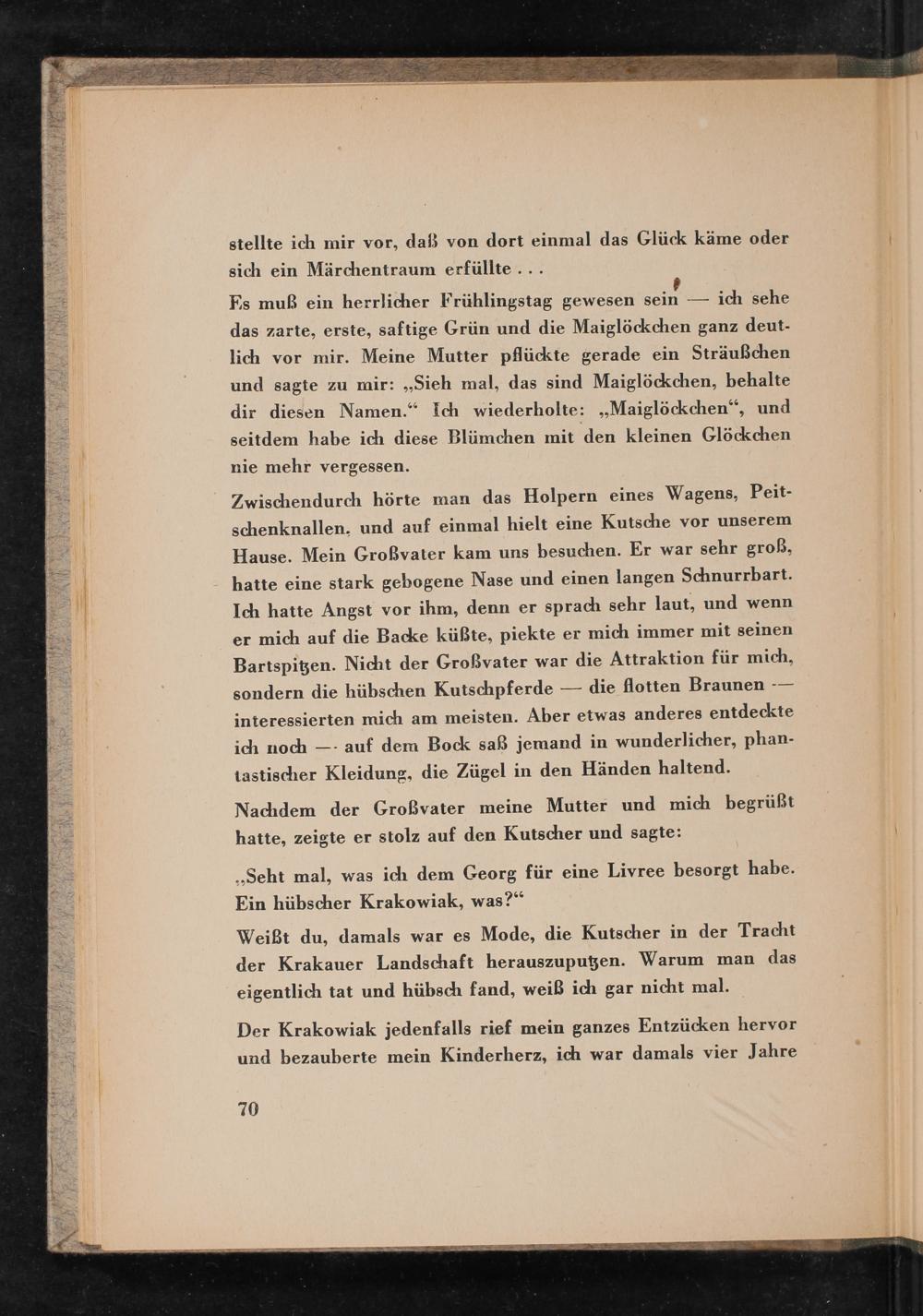 Zwischendurch hörte man das Holpern eines Wagens, Peitschenknallen, und auf einmal hielt eine Kutsche vor unserem Hause. Mein Großvater kam uns besuchen. Er war sehr groß, hatte eine stark gebogene Nase und einen langen Schnurrbart. Ich hatte Angst vor ihm, denn er sprach sehr laut, und wenn er mich auf die Backe küßte, piekte er mich immer mit seinen Bartspitzen. Nicht der Großvater war die Attraktion für mich, die flotten Braunen sondern die hübschen Kutschpferde interessierten mich am meisten. Aber etwas anderes entdeckte ich noch auf dem Bock saß jemand in wunderlicher, phantastischer Kleidung, die Zügel in den Händen haltend.