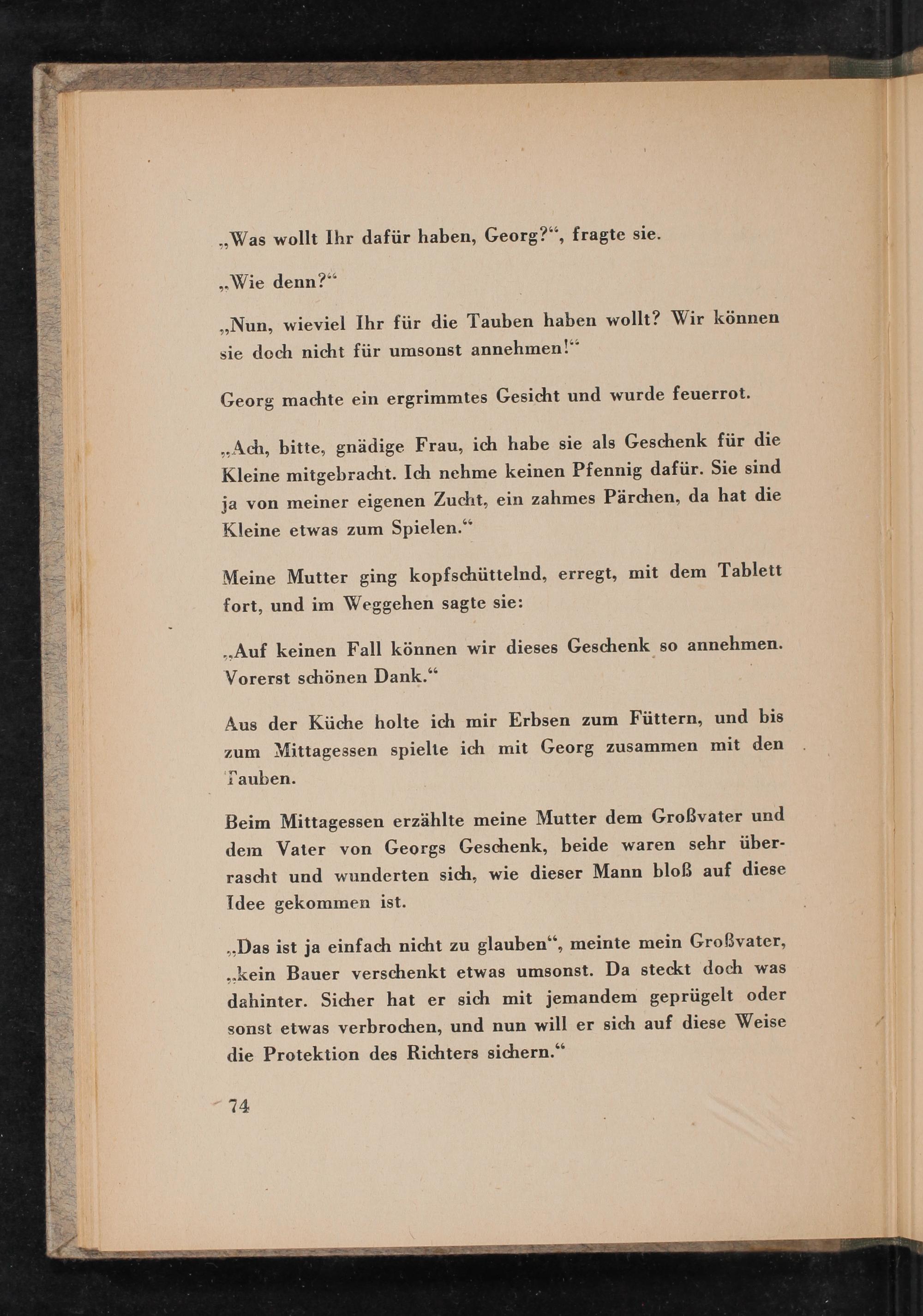 ,, Nun, wieviel Ihr für die Tauben haben wollt? Wir können sie doch nicht für umsonst annehmen!"