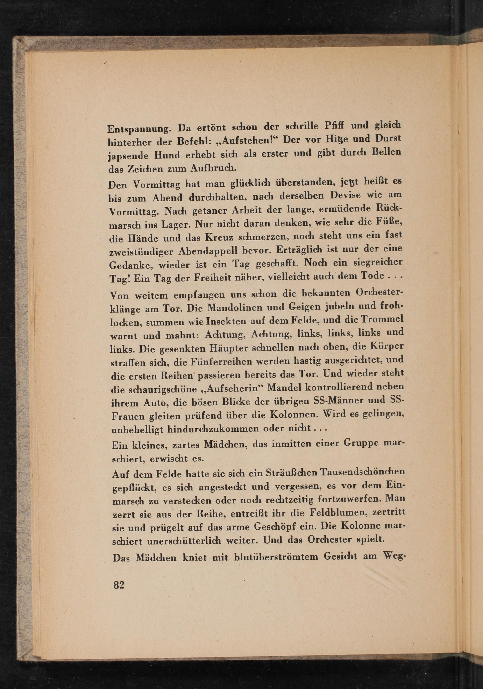 Den Vormittag hat man glücklich überstanden, jetzt heißt es bis zum Abend durchhalten, nach derselben Devise wie am Vormittag. Nach getaner Arbeit der lange, ermüdende Rückmarsch ins Lager. Nur nicht daran denken, wie sehr die Füße, die Hände und das Kreuz schmerzen, noch steht uns ein fast zweistündiger Abendappell bevor. Erträglich ist nur der eine Gedanke, wieder ist ein Tag geschafft. Noch ein siegreicher Tag! Ein Tag der Freiheit näher, vielleicht auch dem Tode... Von weitem empfangen uns schon die bekannten Orchesterklänge am Tor. Die Mandolinen und Geigen jubeln und frohlocken, summen wie Insekten auf dem Felde, und die Trommel warnt und mahnt: Achtung, Achtung, links, links, links und links. Die gesenkten Häupter schnellen nach oben, die Körper straffen sich, die Fünferreihen werden hastig ausgerichtet, und die ersten Reihen passieren bereits das Tor. Und wieder steht die schaurigschöne ,, Aufseherin" Mandel kontrollierend neben ihrem Auto, die bösen Blicke der übrigen SS - Männer und SSFrauen gleiten prüfend über die Kolonnen. Wird es gelingen, unbehelligt hindurchzukommen oder nicht...