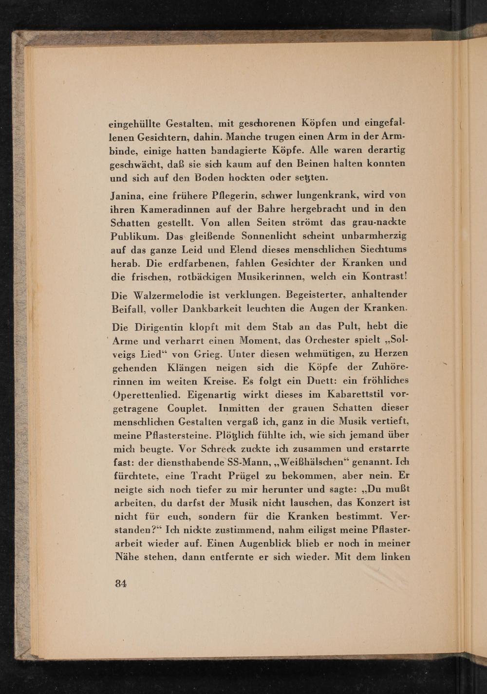 Janina, eine frühere Pflegerin, schwer lungenkrank, wird von ihren Kameradinnen auf der Bahre hergebracht und in den Schatten gestellt. Von allen Seiten strömt das grau- nackte Publikum. Das gleißende Sonnenlicht scheint unbarmherzig auf das ganze Leid und Elend dieses menschlichen Siechtums herab. Die erdfarbenen, fahlen Gesichter der Kranken und die frischen, rotbäckigen Musikerinnen, welch ein Kontrast! Die Walzermelodie ist verklungen. Begeisterter, anhaltender Beifall, voller Dankbarkeit leuchten die Augen der Kranken. Die Dirigentin klopft mit dem Stab an das Pult, hebt die Arme und verharrt einen Moment, das Orchester spielt ,, Solveigs Lied" von Grieg . Unter diesen wehmütigen, zu Herzen gehenden Klängen neigen sich die Köpfe der Zuhörerinnen im weiten Kreise. Es folgt ein Duett: ein fröhliches Operettenlied. Eigenartig wirkt dieses im Kabarettstil vorgetragene Couplet. Inmitten der grauen Schatten dieser menschlichen Gestalten vergaß ich, ganz in die Musik vertieft, meine Pflastersteine. Plötzlich fühlte ich, wie sich jemand über mich beugte. Vor Schreck zuckte ich zusammen und erstarrte fast: der diensthabende SS- Mann ,,, Weißhälschen" genannt. Ich fürchtete, eine Tracht Prügel zu bekommen, aber nein. Er neigte sich noch tiefer zu mir herunter und sagte: ,, Du mußt arbeiten, du darfst der Musik nicht lauschen, das Konzert ist nicht für euch, sondern für die Kranken bestimmt. Verstanden?" Ich nickte zustimmend, nahm eiligst meine Pflasterarbeit wieder auf. Einen Augenblick blieb er noch in meiner Nähe stehen, dann entfernte er sich wieder. Mit dem linken