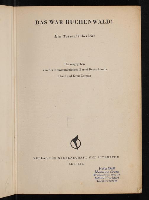 DAS WAR BUCHENWALD! Ein Tatsachenbericht Herausgegeben von der Kommunistischen Partei Deutschlands Stadt und Kreis Leipzig VERLAG FÜR WISSENSCHAFT UND LITERATUR LEIPZIG Heike Duill Marianne Gross Breidensteiner Weg 74 60489 Frankfurt Tel. 069/7893368