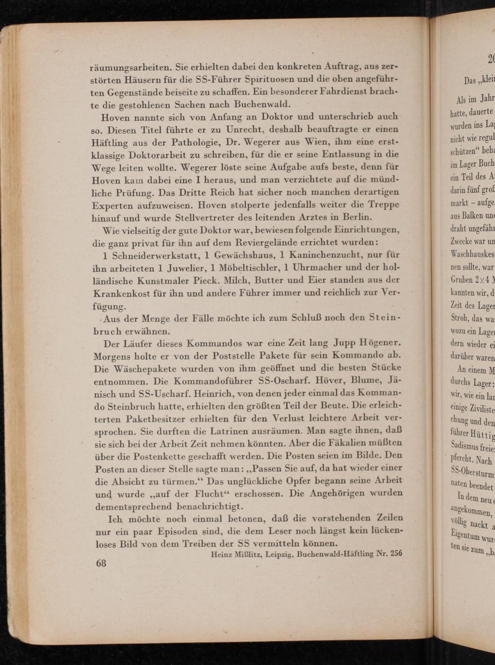 Hoven nannte sich von Anfang an Doktor und unterschrieb auch so. Diesen Titel führte er zu Unrecht, deshalb beauftragte er einen Häftling aus der Pathologie, Dr. Wegerer aus Wien , ihm eine erstklassige Doktorarbeit zu schreiben, für die er seine Entlassung in die Wege leiten wollte. Wegerer löste seine Aufgabe aufs beste, denn für Hoven kam dabei eine I heraus, und man verzichtete auf die mündliche Prüfung. Das Dritte Reich hat sicher noch manchen derartigen Experten aufzuweisen. Hoven stolperte jedenfalls weiter die Treppe hinauf und wurde Stellvertreter des leitenden Arztes in Berlin .