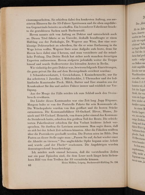Der Läufer dieses Kommandos war eine Zeit lang Jupp Högener. Morgens holte er von der Poststelle Pakete für sein Kommando ab. Die Wäschepakete wurden von ihm geöffnet und die besten Stücke entnommen. Die Kommandoführer SS - Oscharf. Höver, Blume, Jänisch und SS - Uscharf. Heinrich, von denen jeder einmal das Kommando Steinbruch hatte, erhielten den größten Teil der Beute. Die erleichterten Paket besitzer erhielten für den Verlust leichtere Arbeit versprochen. Sie durften die Latrinen ausräumen. Man sagte ihnen, daß sie sich bei der Arbeit Zeit nehmen könnten. Aber die Fäkalien müßten über die Postenkette geschafft werden. Die Posten seien im Bilde. Den Posten an dieser Stelle sagte man: ,, Passen Sie auf, da hat wieder einer die Absicht zu türmen." Das unglückliche Opfer begann seine Arbeit und wurde ,, auf der Flucht" erschossen. Die Angehörigen wurden dementsprechend benachrichtigt.