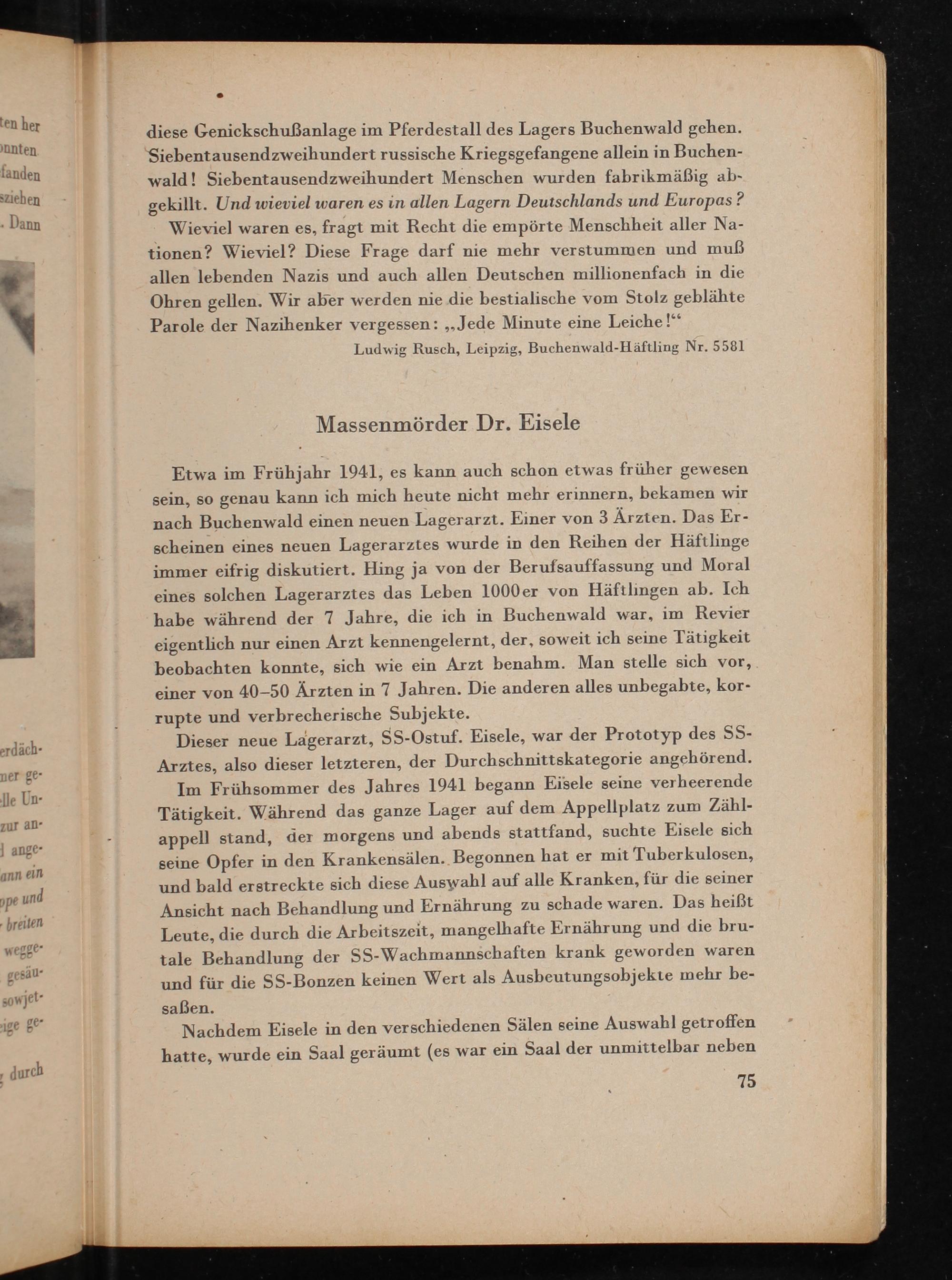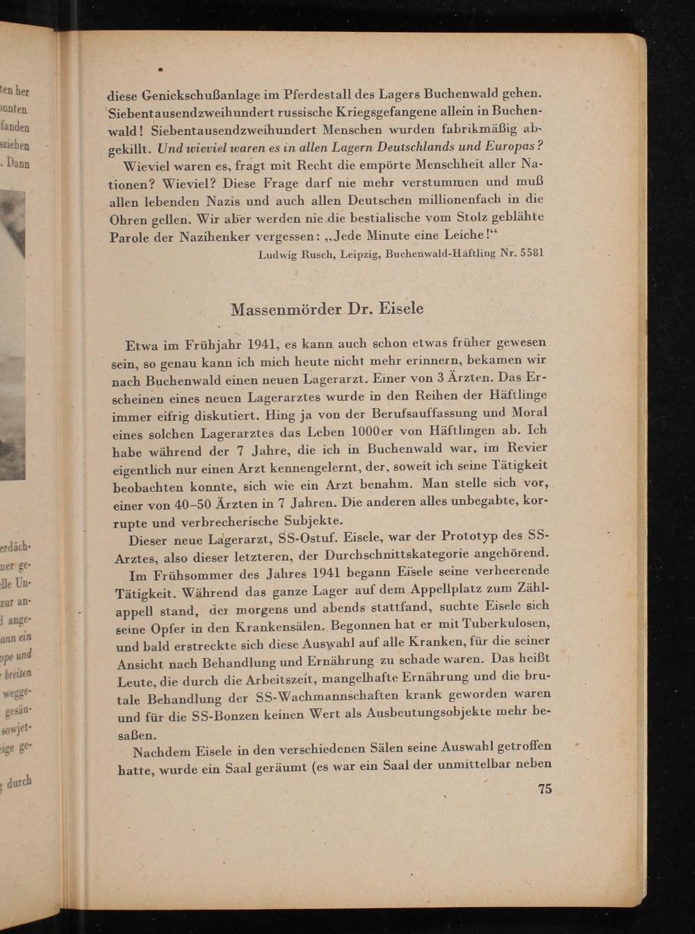 Etwa im Frühjahr 1941, es kann auch schon etwas früher gewesen sein, so genau kann ich mich heute nicht mehr erinnern, bekamen wir nach Buchenwald einen neuen Lagerarzt. Einer von 3 Ärzten. Das Erscheinen eines neuen Lagerarztes wurde in den Reihen der Häftlinge immer eifrig diskutiert. Hing ja von der Berufsauffassung und Moral eines solchen Lagerarztes das Leben 1000 er von Häftlingen ab. Ich habe während der 7 Jahre, die ich in Buchenwald war, im Revier eigentlich nur einen Arzt kennengelernt, der, soweit ich seine Tätigkeit beobachten konnte, sich wie ein Arzt benahm. Man stelle sich vor, einer von 40-50 Ärzten in 7 Jahren. Die anderen alles unbegabte, korrupte und verbrecherische Subjekte.
