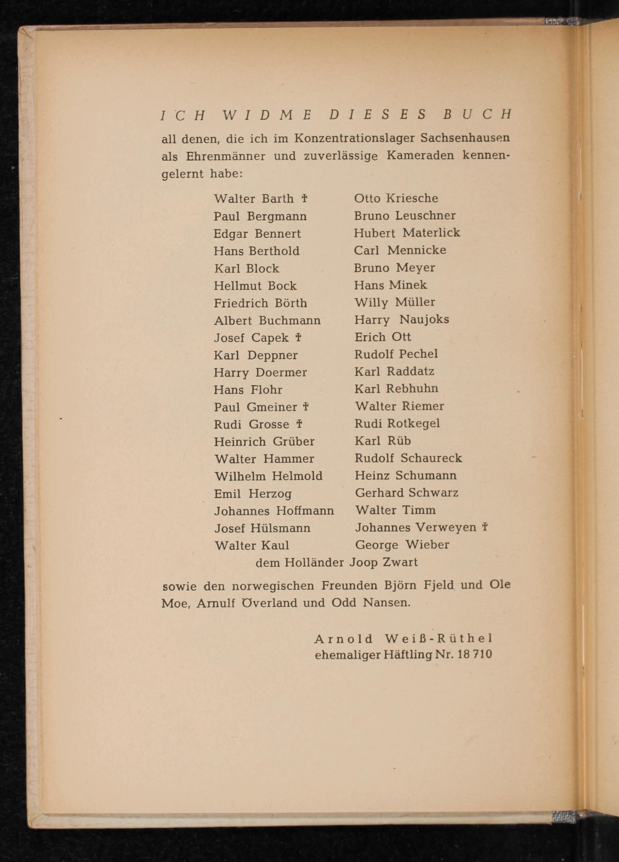 all denen, die ich im Konzentrationslager Sachsenhausen als Ehrenmänner und zuverlässige Kameraden kennengelernt habe: