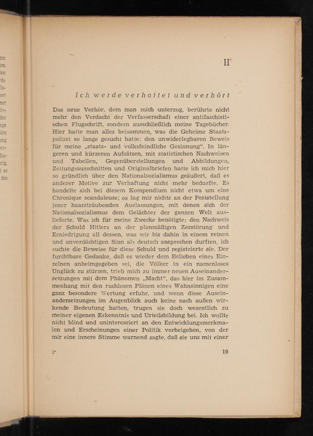 Das neue Verhör, dem man mich unterzog, berührte nicht mehr den Verdacht der Verfasserschaft einer antifaschisti- schen Flugschrift, sondern ausschließlich meine Tagebücher. Hier hatte man alles beisammen, was die Geheime Staats- polizei so lange gesucht hatte: den unwiderlegbaren Beweis für meine„staats- und volksfeindliche Gesinnung“. In län- geren und kürzeren Aufsätzen, mit statistischen Nachweisen und Tabellen, Gegenüberstellungen und Abbildungen, Zeitungsausschnitten und Originalbriefen hatte ich mich hier so gründlich über den Nationalsozialismus geäußert, daß es anderer Motive zur Verhaftung nicht mehr bedurfte. Es handelte sich bei diesem Kompendium nicht etwa um eine Chronique scandaleuse; es lag mir nichts an der Feststellung jener haarsträubenden Auslassungen, mit denen sich der Nationalsozialismus dem Gelächter der ganzen Welt aus- lieferte. Was ich für meine Zwecke benötigte: den Nachweis der Schuld Hitlers an der planmäßigen Zerstörung und Erniedrigung all dessen, was wir bis dahin in einem reinen und unverdächtigen Sinn als deutsch ansprechen durften, ich suchte die Beweise für diese Schuld und registrierte sie. Der furchtbare Gedanke, daß es wieder dem Belieben eines Ein- zelnen anheimgegeben sei, die Völker in ein namenloses Unglück zu stürzen, trieb mich zu immer neuen Auseinander- setzungen mit dem Phänomen„Macht“, das hier im Zusam- menhang mit den ruchlosen Plänen eines Wahnsinnigen eine ganz besondere Wertung erfuhr, und wenn diese Ausein- andersetzungen im Augenblick auch keine nach außen wir- kende Bedeutung hatten, trugen sie doch wesentlich zu meiner eigenen Erkenntnis und Urteilsbildung bei. Ich wollte nicht blind und uninteressiert an den Entwicklungsmerkma- len und Erscheinungen einer Politik vorbeigehen, von der mir eine innere Stimme warnend sagte, daß sie uns mit einer
