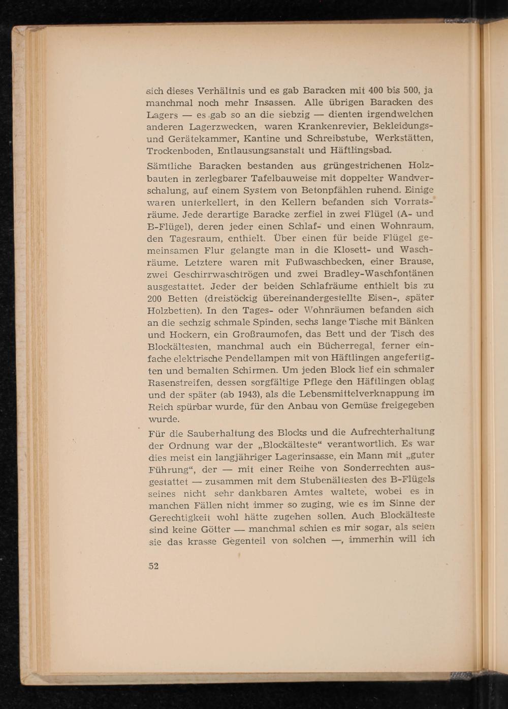 Für die Sauberhaltung des Blocks und die Aufrechterhaltung der Ordnung war der„ Blockälteste" verantwortlich. Es war dies meist ein langjähriger Lagerinsasse, ein Mann mit„ guter Führung", der mit einer Reihe von Sonderrechten ausgestattet zusammen mit dem Stubenältesten des B- Flügels seines nicht sehr dankbaren Amtes waltete, wobei es in manchen Fällen nicht immer so zuging, wie es im Sinne der Gerechtigkeit wohl hätte zugehen sollen. Auch Blockälteste sind keine Götter manchmal schien es mir sogar, als seien sie das krasse Gegenteil von solchen immerhin will ich