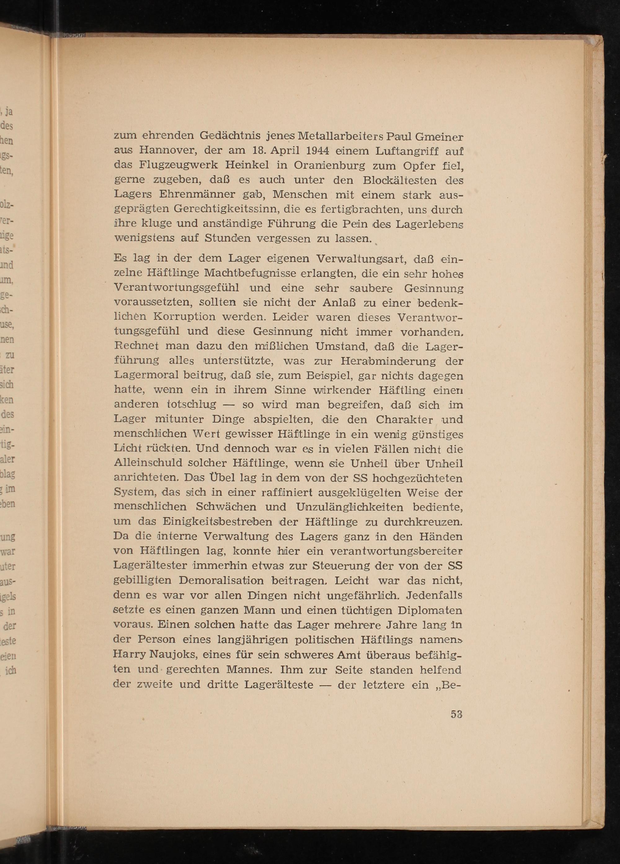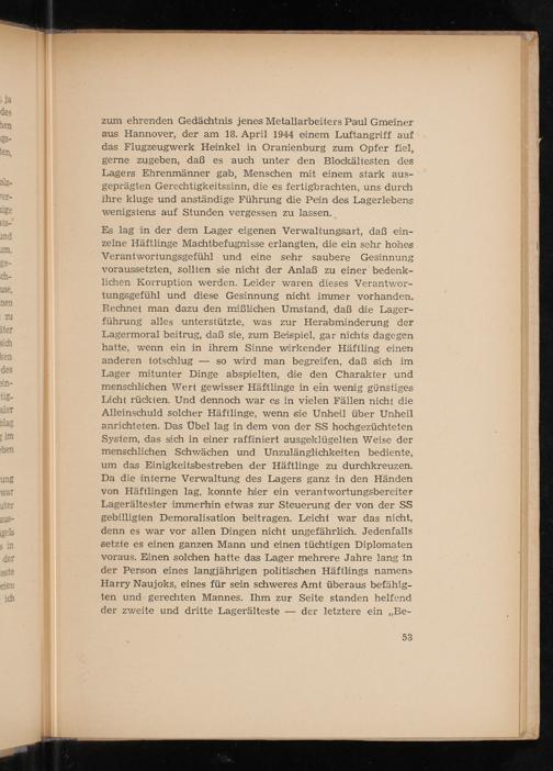 zum ehrenden Gedächtnis jenes Metallarbeiters Paul Gmeiner aus Hannover , der am 18. April 1944 einem Luftangriff auf das Flugzeugwerk Heinkel in Oranienburg zum Opfer fiel, gerne zugeben, daß es auch unter den Blockältesten des Lagers Ehrenmänner gab, Menschen mit einem stark aus- geprägten Gerechtigkeitssinn, die es fertigbrachten, uns durch ihre kluge und anständige Führung die Pein des Lagerlebens wenigstens auf Stunden vergessen zu lassen.
