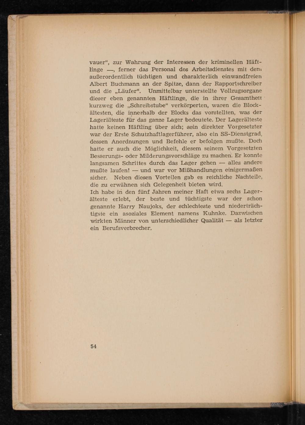 Ich habe in den fünf Jahren meiner Haft etwa sechs Lagerälteste erlebt, der beste und tüchtigste war der schon genannte Harry Naujoks , der schlechteste und niederträchtigste ein asoziales Element namens Kuhnke. Dazwischen wirkten Männer von unterschiedlicher Qualität als letzter ein Berufsverbrecher,