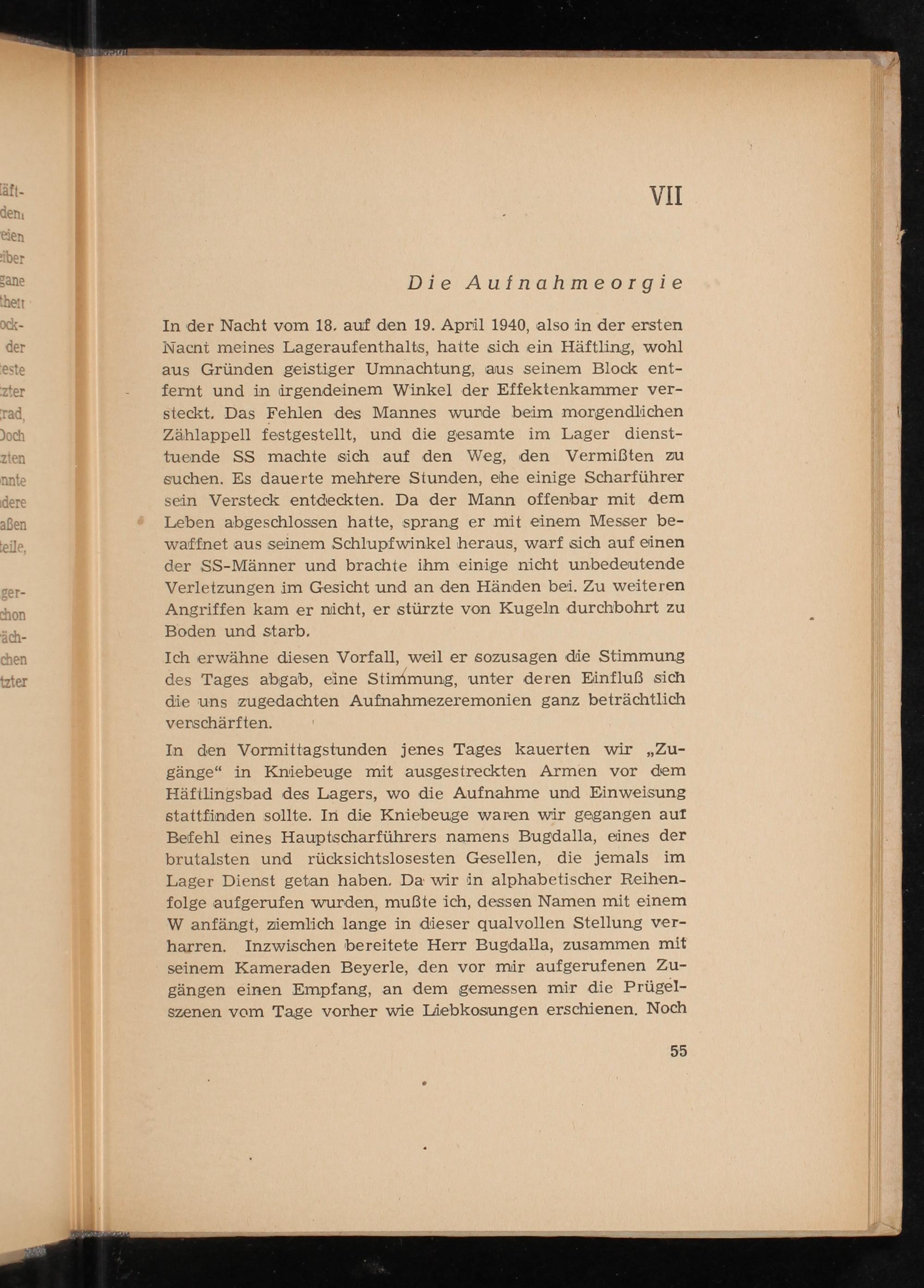 In der Nacht vom 18, auf den 19. April 1940, also in der ersten Nacnt meines Lageraufenthalts, hatte sich ein Häftling, wohl aus Gründen geistiger Umnachtung, aus seinem Block ent- fernt und in irgendeinem Winkel der Effektenkammer ver- steckt. Das Fehlen des Mannes wurde beim morgendlichen Zählappell festgestellt, und die gesamte im Lager dienst- tuende SS machte sich auf den Weg, den Vermißten zu suchen. Es dauerte mehrere Stunden, ehe einige Scharführer sein Versteck entdeckten. Da der Mann offenbar mit dem Leben abgeschlossen hatte, sprang er mit einem Messer be- waffnet aus seinem Schlupfwinkel heraus, warf sich auf einen der SS -Männer und brachte ihm einige nicht unbedeutende Verletzungen im Gesicht und an den Händen bei. Zu weiteren Angriffen kam er nicht, er stürzte von Kugeln durchbohrt zu Boden und starb,