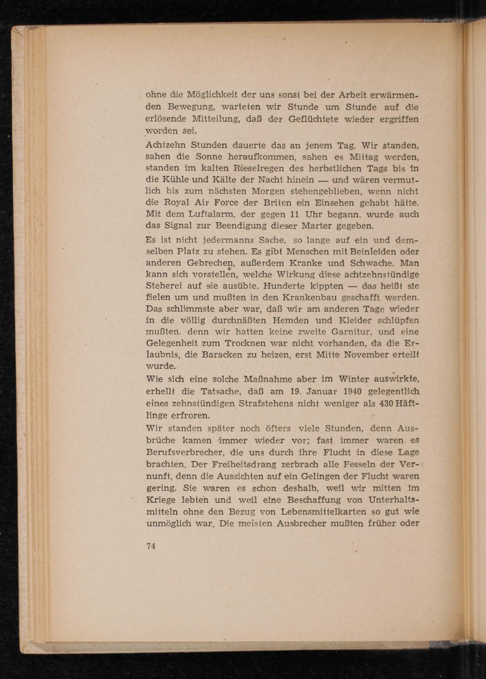 Wir standen später noch öfters viele Stunden, denn Ausbrüche kamen immer wieder vor; fast immer waren es Berufsverbrecher, die uns durch ihre Flucht in diese Lage brachten. Der Freiheitsdrang zerbrach alle Fesseln der Vernunft, denn die Aussichten auf ein Gelingen der Flucht waren gering. Sie waren es schon deshalb, weil wir mitten im Kriege lebten und weil eine Beschaffung von Unterhaltsmitteln ohne den Bezug von Lebensmittelkarten so gut wie unmöglich war. Die meisten Ausbrecher mußten früher oder