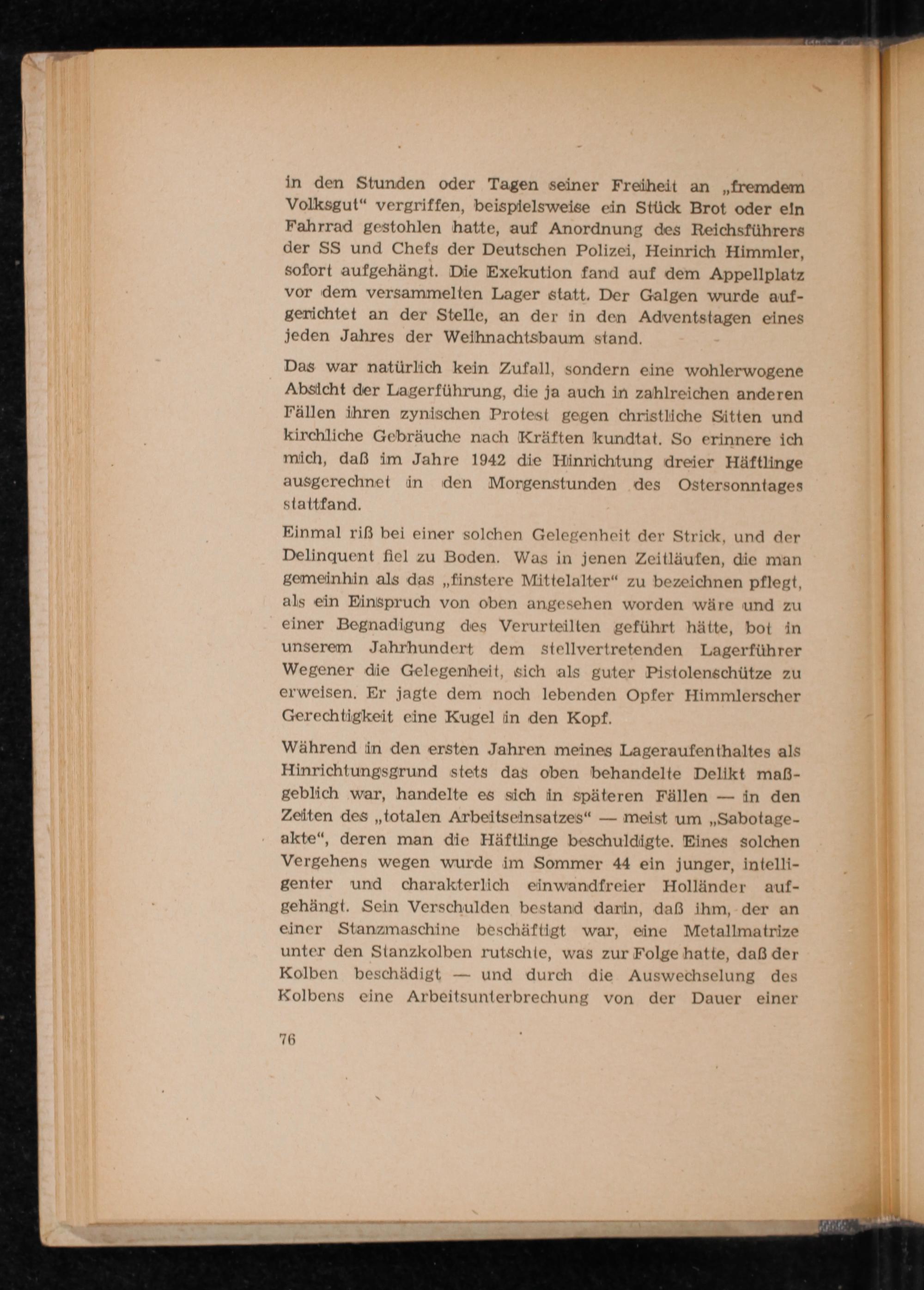 Das war natürlich kein Zufall, sondern eine wohlerwogene Absicht der Lagerführung, die ja auch in zahlreichen anderen Fällen ihren zynischen Protest gegen christliche Sitten und kirchliche Gebräuche nach Kräften kundtat. So erinnere ich mich, daß im Jahre 1942 die Hinrichtung dreier Häftlinge ausgerechnet in den Morgenstunden des Ostersonntages stattfand.