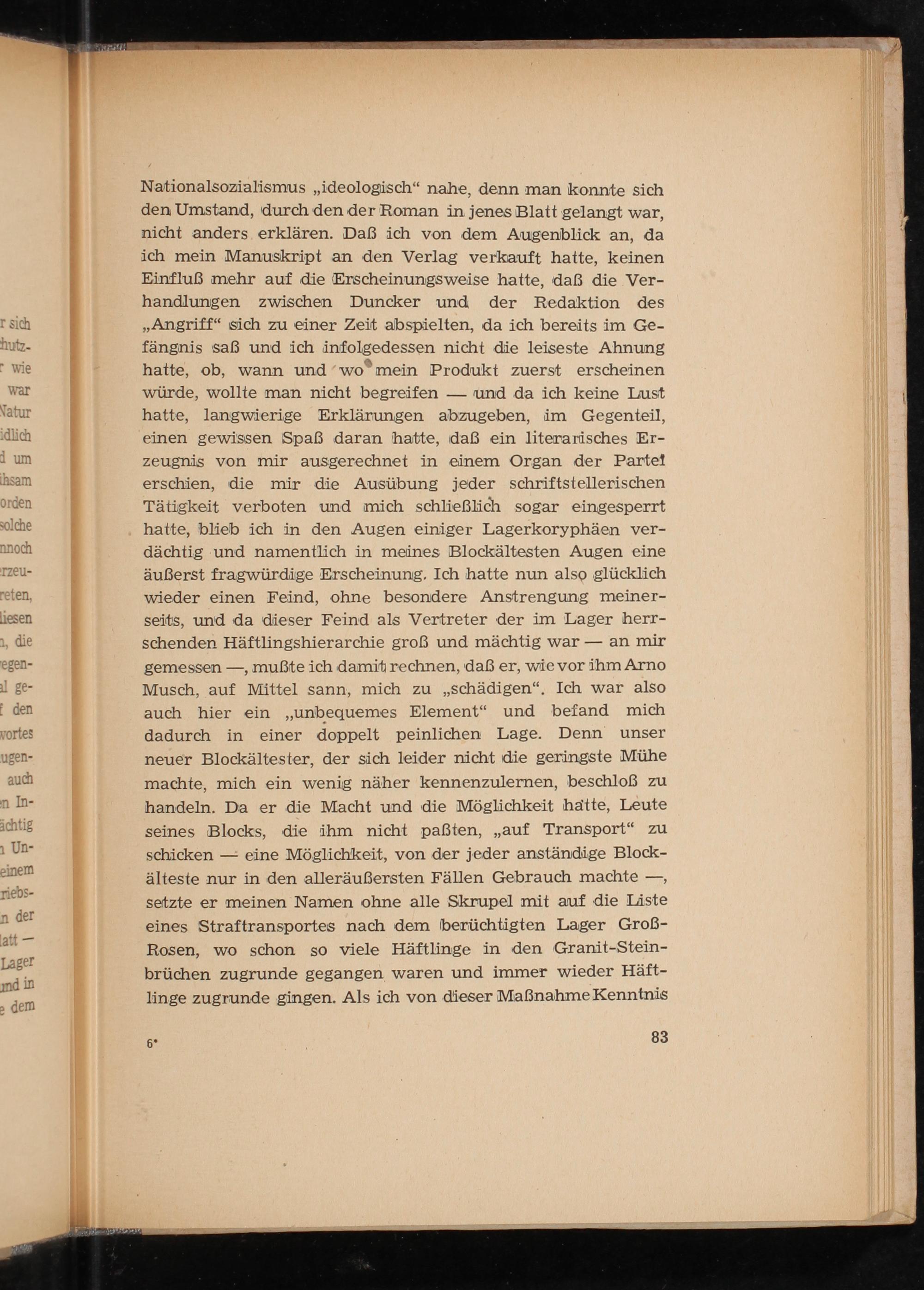 Nationalsozialismus „ideologisch“ nahe, denn man konnte sich den Umstand, durch den der Roman in jenes Blatt gelangt war, nicht anders erklären. Daß ich von dem Augenblick an, da ich mein Manuskript an den Verlag verkauft hatte, keinen Einfluß mehr auf die Erscheinungsweise hatte, daß die Ver- handlungen zwischen Duncker und der Redaktion des „Angriff“ sich zu einer Zeit abspielten, da ich bereits im Ge- fängnis saß und ich infolgedessen nicht die leiseste Ahnung hatte, ob, wann und“wo” mein Produkt zuerst erscheinen würde, wollte man nicht begreifen— und da ich keine Lust hatte, langwierige Erklärungen abzugeben, im Gegenteil, einen gewissen Spaß daran hatte, daß ein literarisches Er- zeugnis von mir ausgerechnet in einem Organ der Partei erschien, die mir die Ausübung jeder schriftstellerischen Tätigkeit verboten und mich schließlich sogar eingesperrt hatte, blieb ich in den Augen einiger Lagerkoryphäen ver- dächtig und namentlich in meines Blockältesten Augen eine äußerst fragwürdige Erscheinung. Ich hatte nun also glücklich wieder einen Feind, ohne besondere Anstrengung meiner- seits, und da dieser Feind als Vertreter der im Lager herr- schenden Häftlingshierarchie groß und mächtig war— an mir gemessen—, mußte ich damit rechnen, daß er, wie vor ihm Arno Musch, auf Mittel sann, mich zu„schädigen“. Ich war also auch hier ein„unbequemes Element“ und befand mich dadurch in einer doppelt peinlichen Lage. Denn unser neuer Blockältester, der sich leider nicht die geringste Mühe machte, mich ein wenig näher kennenzulernen, beschloß zu handeln. Da er die Macht und die Möglichkeit hätte, Leute seines Blocks, die ihm nicht paßten,„auf Transport“ zu schicken— eine Möglichkeit, von der jeder anständige Block- älteste nur in den alleräußersten Fällen Gebrauch machte—, setzte er meinen Namen ohne alle Skrupel mit auf die Liste eines Straftransportes nach dem berüchtigten Lager Groß- Rosen, wo schon so viele Häftlinge in den Granit-Stein-
