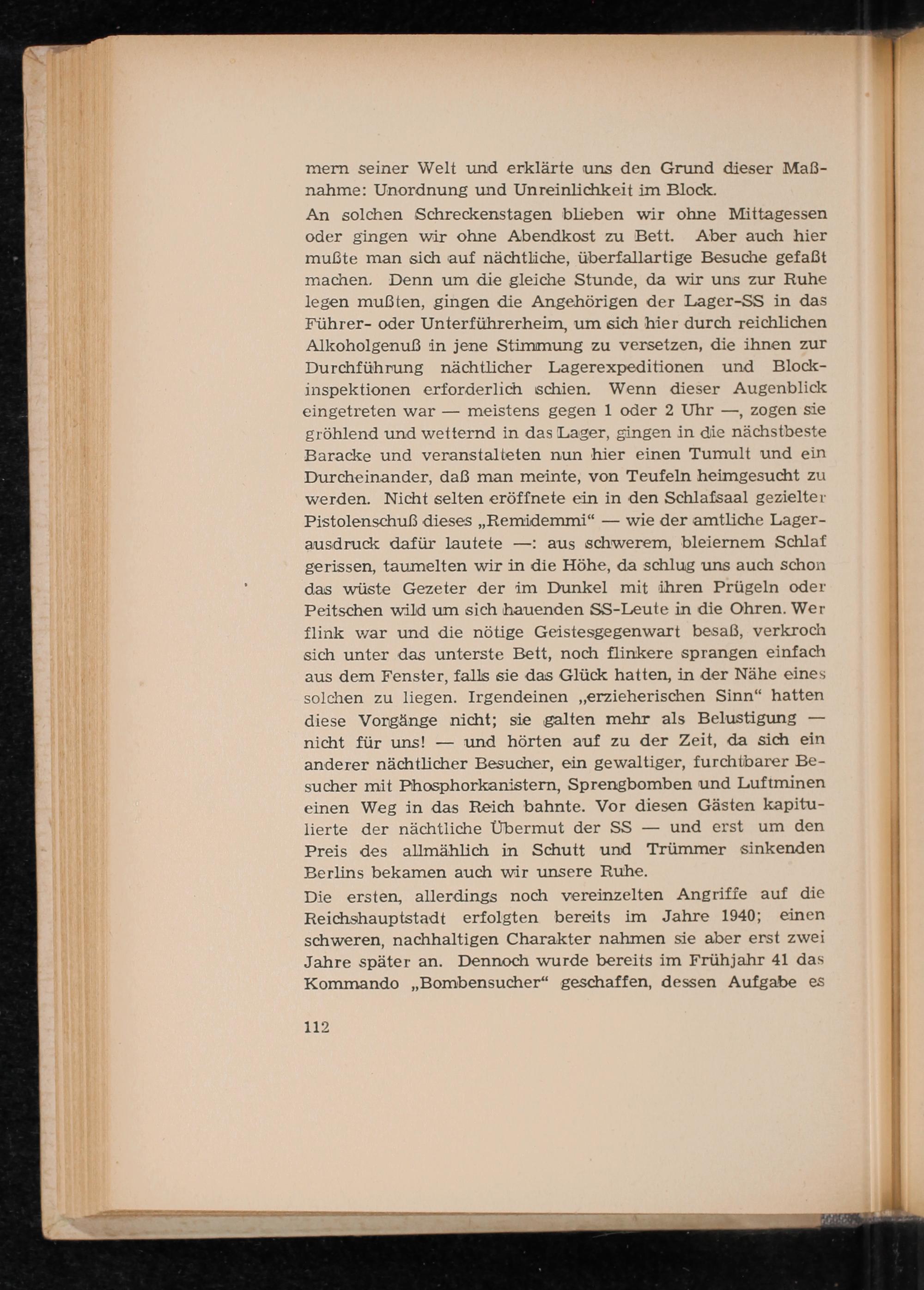 An solchen Schreckenstagen blieben wir ohne Mittagessen oder gingen wir ohne Abendkost zu Bett. Aber auch hier mußte man sich auf nächtliche, überfallartige Besuche gefaßt machen. Denn um die gleiche Stunde, da wir uns zur Ruhe legen mußten, gingen die Angehörigen der Lager- SS in das Führer- oder Unterführerheim, um sich hier durch reichlichen Alkoholgenuẞ in jene Stimmung zu versetzen, die ihnen zur Durchführung nächtlicher Lagerexpeditionen und Blockinspektionen erforderlich schien. Wenn dieser Augenblick eingetreten war meistens gegen 1 oder 2 Uhr-, zogen sie gröhlend und wetternd in das Lager, gingen in die nächstbeste Baracke und veranstalteten nun hier einen Tumult und ein Durcheinander, daß man meinte, von Teufeln heimgesucht zu werden. Nicht selten eröffnete ein in den Schlafsaal gezielter Pistolenschuẞ dieses ,, Remidemmi"- wie der amtliche Lagerausdruck dafür lautete-: aus schwerem, bleiernem Schlaf gerissen, taumelten wir in die Höhe, da schlug uns auch schon das wüste Gezeter der im Dunkel mit ihren Prügeln oder Peitschen wild um sich hauenden SS - Leute in die Ohren. Wer flink war und die nötige Geistesgegenwart besaß, verkroch sich unter das unterste Bett, noch flinkere sprangen einfach aus dem Fenster, falls sie das Glück hatten, in der Nähe eines solchen zu liegen. Irgendeinen ,, erzieherischen Sinn" hatten diese Vorgänge nicht; sie galten mehr als Belustigung nicht für uns! und hörten auf zu der Zeit, da sich ein anderer nächtlicher Besucher, ein gewaltiger, furchtbarer Besucher mit Phosphorkanistern, Sprengbomben und Luftminen einen Weg in das Reich bahnte. Vor diesen Gästen kapitulierte der nächtliche Übermut der SS - und erst um den Preis des allmählich in Schutt und Trümmer sinkenden Berlins bekamen auch wir unsere Ruhe.