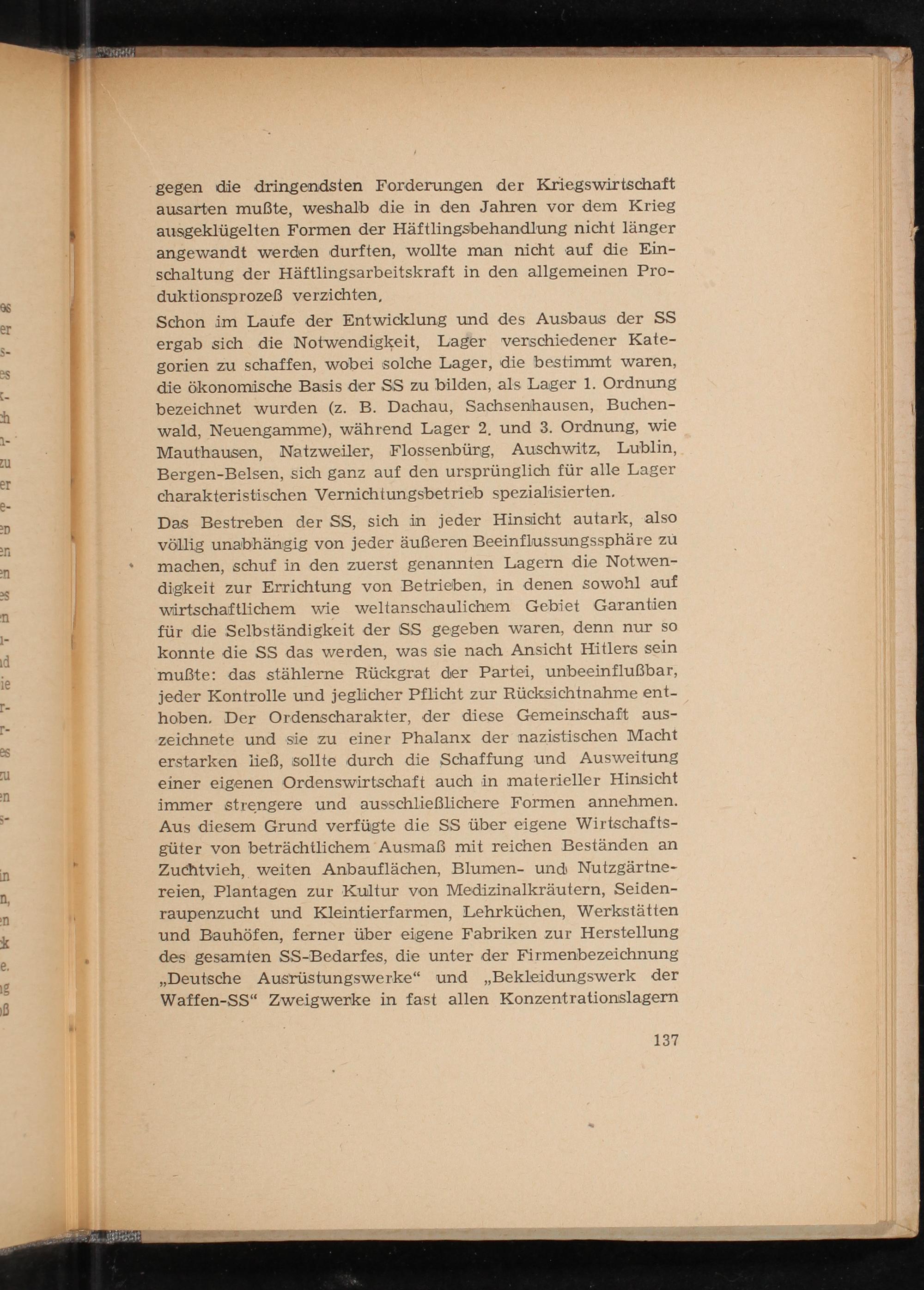 Schon im Laufe der Entwicklung und des Ausbaus der SS ergab sich die Notwendigkeit, Lager verschiedener Kate- gorien zu schaffen, wobei solche Lager, die bestimmt waren, die ökonomische Basis der SS zu bilden, als Lager 1. Ordnung bezeichnet wurden(z. B. Dachau, Sachsenhausen, Buchen- wald, Neuengamme ), während Lager 2. und 3. Ordnung, wie Mauthausen, Natzweiler, Flossenbürg, Auschwitz, Lublin , Bergen-Belsen , sich ganz auf den ursprünglich für alle Lager charakteristischen Vernichtungsbetrieb spezialisierten.