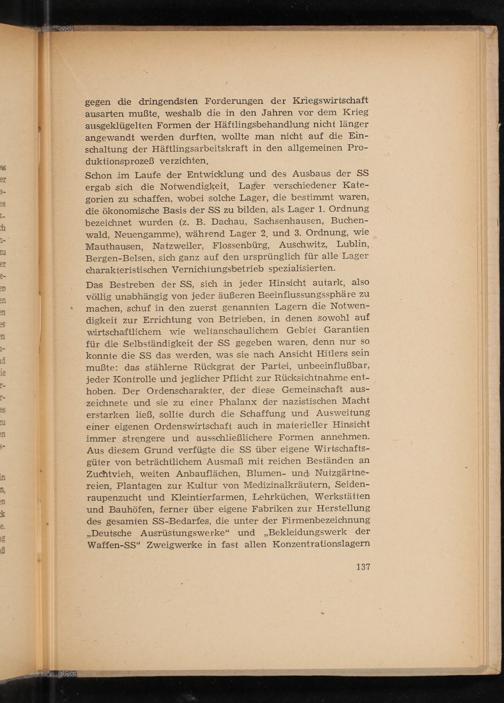 Das Bestreben der SS, sich in jeder Hinsicht autark, also völlig unabhängig von jeder äußeren Beeinflussungssphäre zu machen, schuf in den zuerst genannten Lagern die Notwen- digkeit zur Errichtung von Betrieben, in denen sowohl auf wirtschaftlichem wie weltanschaulichem Gebiet Garantien für die Selbständigkeit der SS gegeben waren, denn nur SO