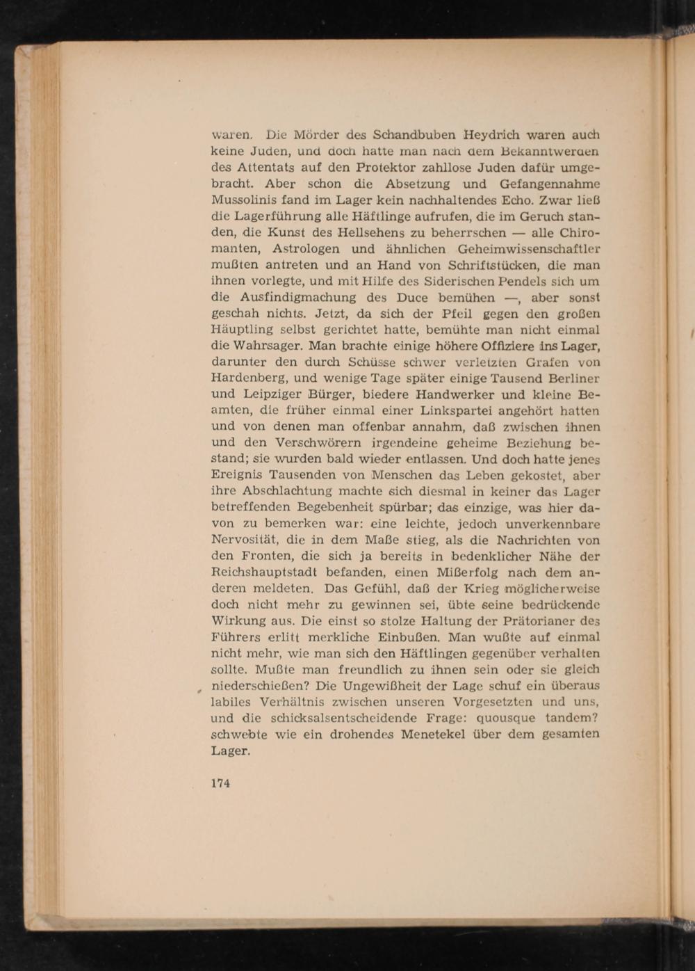 waren. Die Mörder des Schandbuben Heydrich waren auch keine Juden, und doch hatte man nach dem Bekanntwerden des Attentats auf den Protektor zahllose Juden dafür umgebracht. Aber schon die Absetzung und Gefangennahme Mussolinis fand im Lager kein nachhaltendes Echo. Zwar ließ die Lagerführung alle Häftlinge aufrufen, die im Geruch standen, die Kunst des Hellsehens zu beherrschen alle Chiromanten, Astrologen und ähnlichen Geheimwissenschaftler mußten antreten und an Hand von Schriftstücken, die man ihnen vorlegte, und mit Hilfe des Siderischen Pendels sich um die Ausfindigmachung des Duce bemühen, aber sonst geschah nichts. Jetzt, da sich der Pfeil gegen den großen Häuptling selbst gerichtet hatte, bemühte man nicht einmal die Wahrsager. Man brachte einige höhere Offiziere ins Lager, darunter den durch Schüsse schwer verletzten Grafen von Hardenberg, und wenige Tage später einige Tausend Berliner und Leipziger Bürger, biedere Handwerker und kleine Beamten, die früher einmal einer Linkspartei angehört hatten und von denen man offenbar annahm, daß zwischen ihnen und den Verschwörern irgendeine geheime Beziehung bestand; sie wurden bald wieder entlassen. Und doch hatte jenes Ereignis Tausenden von Menschen das Leben gekostet, aber ihre Abschlachtung machte sich diesmal in keiner das Lager betreffenden Begebenheit spürbar; das einzige, was hier davon zu bemerken war: eine leichte, jedoch unverkennbare Nervosität, die in dem Maße stieg, als die Nachrichten von den Fronten, die sich ja bereits in bedenklicher Nähe der Reichshauptstadt befanden, einen Mißerfolg nach dem anderen meldeten. Das Gefühl, daß der Krieg möglicherweise doch nicht mehr zu gewinnen sei, übte seine bedrückende Wirkung aus. Die einst so stolze Haltung der Prätorianer des Führers erlitt merkliche Einbußen. Man wußte auf einmal nicht mehr, wie man sich den Häftlingen gegenüber verhalten sollte. Muẞte man freundlich zu ihnen sein oder sie gleich niederschießen? Die Ungewißheit der Lage schuf ein überaus labiles Verhältnis zwischen unseren Vorgesetzten und uns, und die schicksalsentscheidende Frage: quousque tandem? schwebte wie ein drohendes Menetekel über dem gesamten Lager.