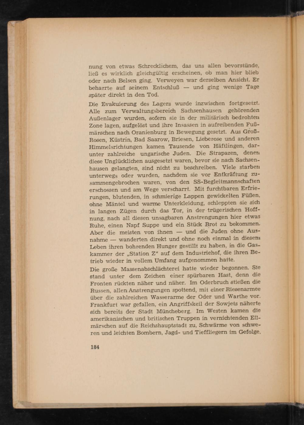 Die Evakuierung des Lagers wurde inzwischen fortgesetzt. Alle zum Verwaltungsbereich Sachsenhausen gehörenden Außenlager wurden, sofern sie in der militärisch bedrohten Zone lagen, aufgelöst und ihre Insassen in aufreibenden Fußmärschen nach Oranienburg in Bewegung gesetzt. Aus GroßRosen, Küstrin, Bad Saarow, Briesen, Lieberose und anderen Himmelsrichtungen kamen Tausende von Häftlingen, darunter zahlreiche ungarische Juden. Die Strapazen, denen diese Unglücklichen ausgesetzt waren, bevor sie nach Sachsenhausen gelangten, sind nicht zu beschreiben. Viele starben unterwegs oder wurden, nachdem sie vor Entkräftung zusammengebrochen waren, von den SS- Begleitmannschaften erschossen und am Wege verscharrt. Mit furchtbaren Erfrierungen, blutenden, in schmierige Lappen gewickelten Füßen, ohne Mäntel und warme Unterkleidung, schleppten sie sich in langen Zügen durch das Tor, in der trügerischen Hoffnung, nach all diesen unsagbaren Anstrengungen hier etwas Ruhe, einen Napf Suppe und ein Stück Brot zu bekommen. Aber die meisten von ihnen und die Juden ohne Ausnahme wanderten direkt und ohne noch einmal in dieseni Leben ihren bohrenden Hunger gestillt zu haben, in die Gaskammer der„ Station Z" auf dem Industriehof, die ihren Betrieb wieder in vollem Umfang aufgenommen hatte. Die große Massenabschlächterei hatte wieder begonnen. Sie stand unter dem Zeichen einer spürbaren Hast, denn die Fronten rückten näher und näher. Im Oderbruch stießen die Russen, allen Anstrengungen spottend, mit einer Riesenarmee über die zahlreichen Wasserarme der Oder und Warthe vor. Frankfurt war gefallen, ein Angriffskeil der Sowjets näherte sich bereits der Stadt Müncheberg . Im Westen kamen die amerikanischen und britischen Truppen in vernichtenden Ellmärschen auf die Reichshauptstadt zu, Schwärme von schweren und leichten Bombern, Jagd- und Tieffliegern im Gefolge.