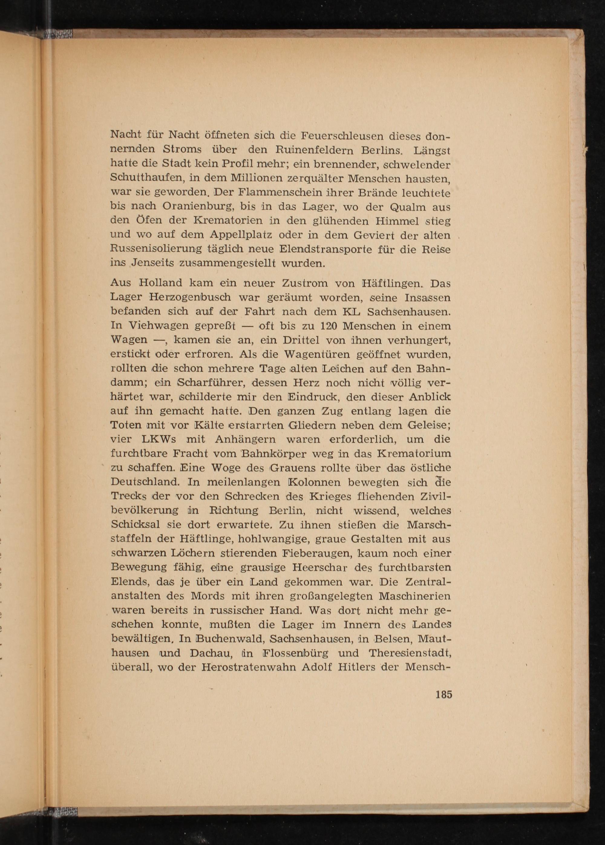 Nacht für Nacht öffneten sich die Feuerschleusen dieses don- nernden Stroms über den Ruinenfeldern Berlins . Längst hatte die Stadt kein Profil mehr; ein brennender, schwelender Schutthaufen, in dem Millionen zerquälter Menschen hausten, war sie geworden, Der Flammenschein ihrer Brände leuchtete bis nach Oranienburg , bis in das Lager, wo der Qualm aus den Öfen der Krematorien in den glühenden Himmel stieg und wo auf dem Appellplatz oder in dem Geviert der alten. Russenisolierung täglich neue Elendstransporte für die Reise ins Jenseits zusammengestellt wurden.