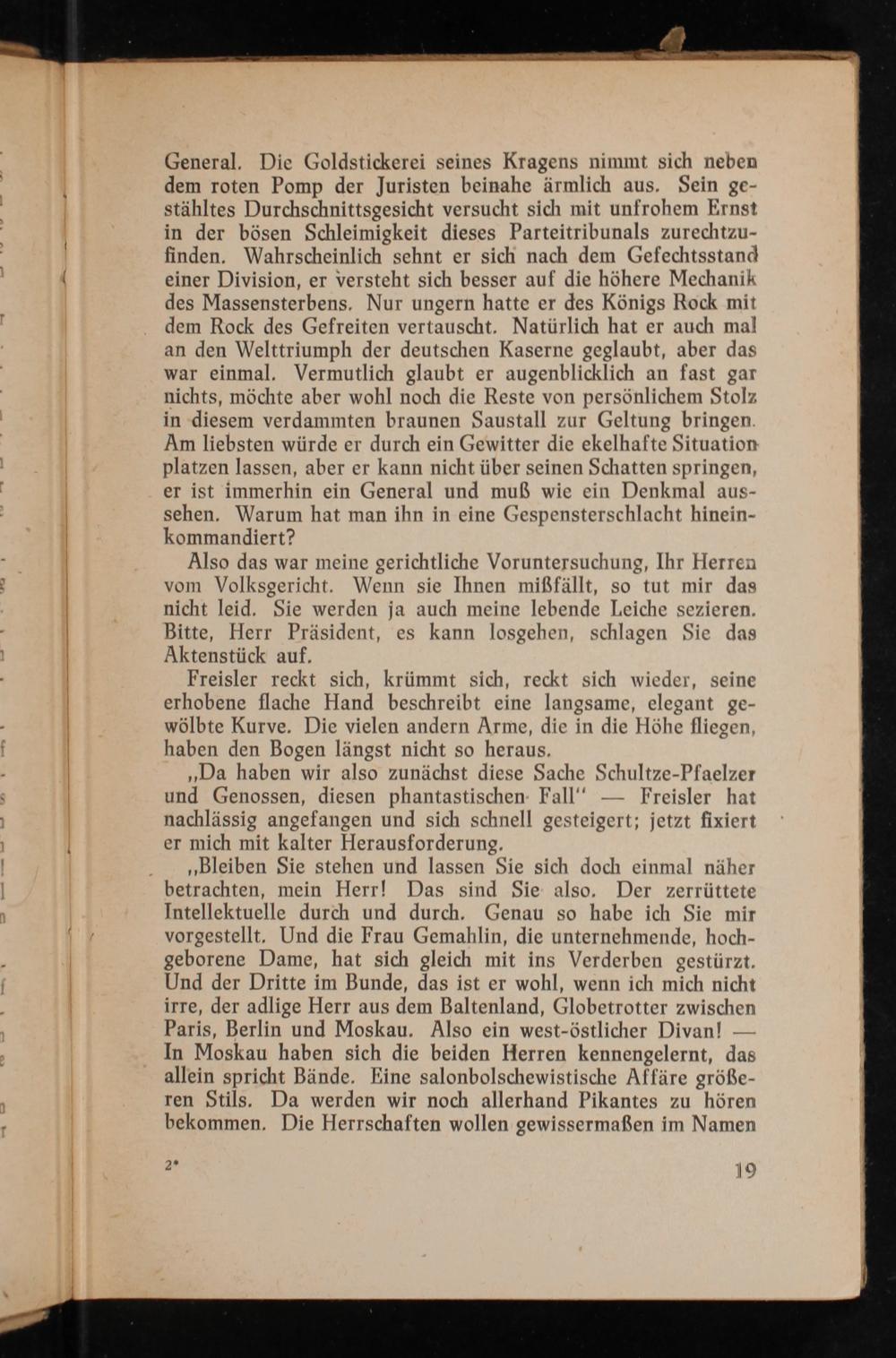 General. Die Goldstickerei seines Kragens nimmt sich neben dem roten Pomp der Juristen beinahe ärmlich aus. Sein gestähltes Durchschnittsgesicht versucht sich mit unfrohem Ernst in der bösen Schleimigkeit dieses Parteitribunals zurechtzufinden. Wahrscheinlich sehnt er sich nach dem Gefechtsstand einer Division, er versteht sich besser auf die höhere Mechanik des Massensterbens. Nur ungern hatte er des Königs Rock mit dem Rock des Gefreiten vertauscht. Natürlich hat er auch mal an den Welttriumph der deutschen Kaserne geglaubt, aber das war einmal. Vermutlich glaubt er augenblicklich an fast gar nichts, möchte aber wohl noch die Reste von persönlichem Stolz in diesem verdammten braunen Saustall zur Geltung bringen. Am liebsten würde er durch ein Gewitter die ekelhafte Situation platzen lassen, aber er kann nicht über seinen Schatten springen, er ist immerhin ein General und muß wie ein Denkmal aussehen. Warum hat man ihn in eine Gespensterschlacht hineinkommandiert?