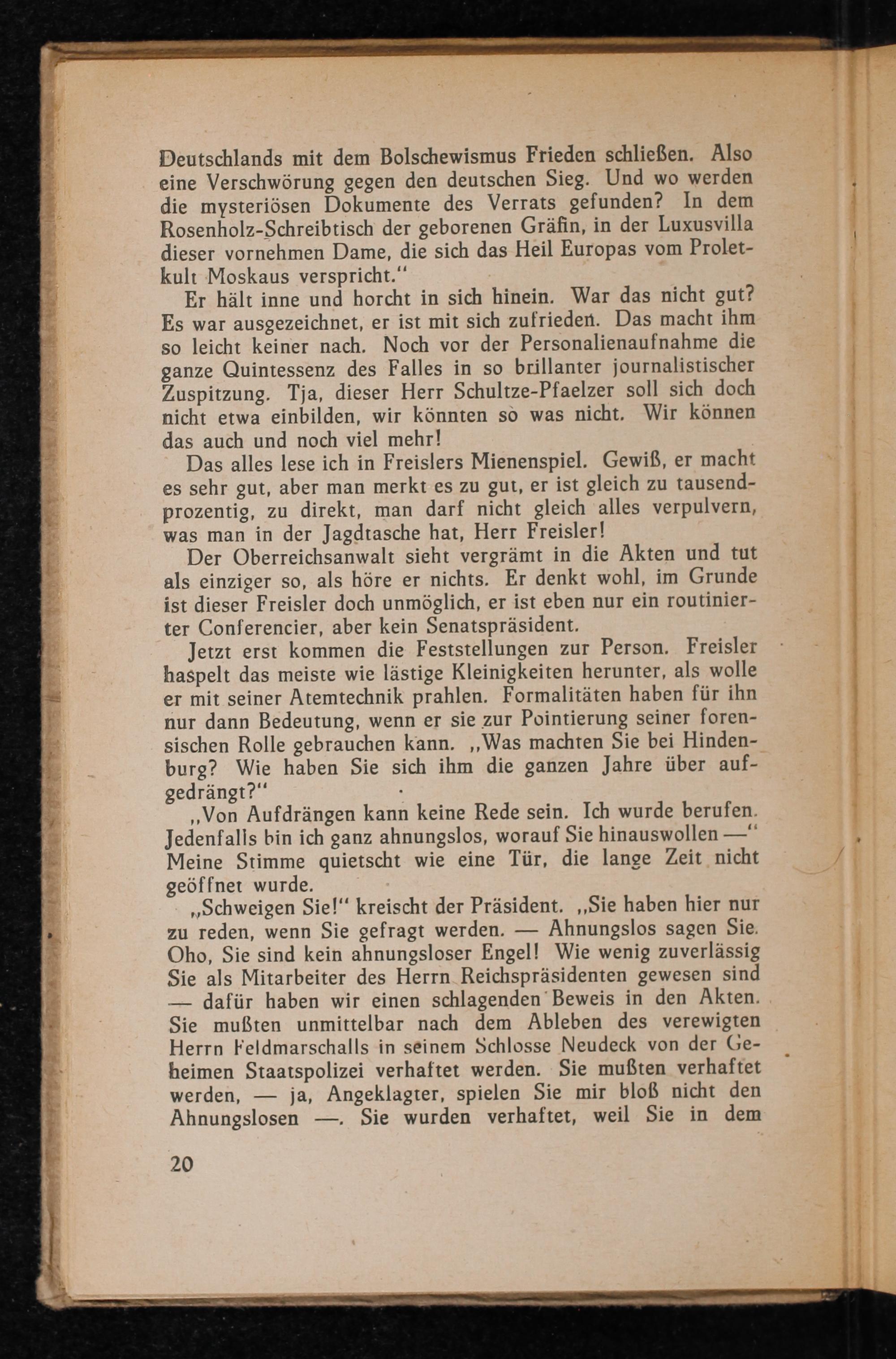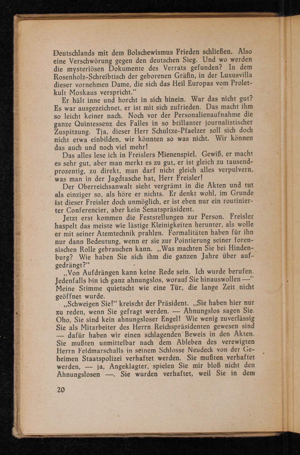Jetzt erst kommen die Feststellungen zur Person. Freisler haspelt das meiste wie lästige Kleinigkeiten herunter, als wolle er mit seiner Atemtechnik prahlen. Formalitäten haben für ihn nur dann Bedeutung, wenn er sie zur Pointierung seiner foren- sischen Rolle gebrauchen kann. ‚Was machten Sie bei Hinden- burg? Wie haben Sie sich ihm die ganzen Jahre über auf- gedrängt?“.