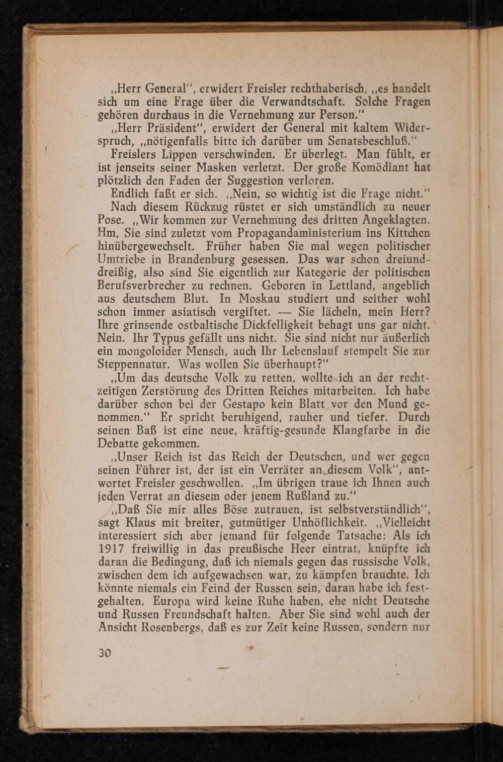 ,, Unser Reich ist das Reich der Deutschen, und wer gegen seinen Führer ist, der ist ein Verräter an diesem Volk", antwortet Freisler geschwollen. ,, Im übrigen traue ich Ihnen auch jeden Verrat an diesem oder jenem Rußland zu."
