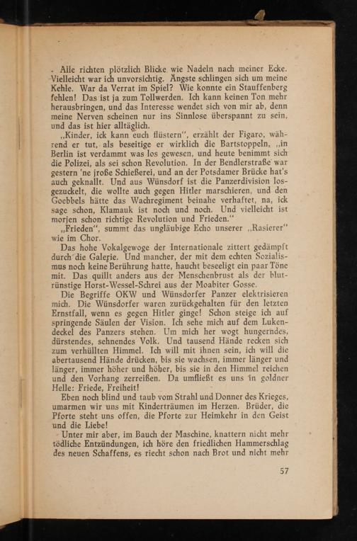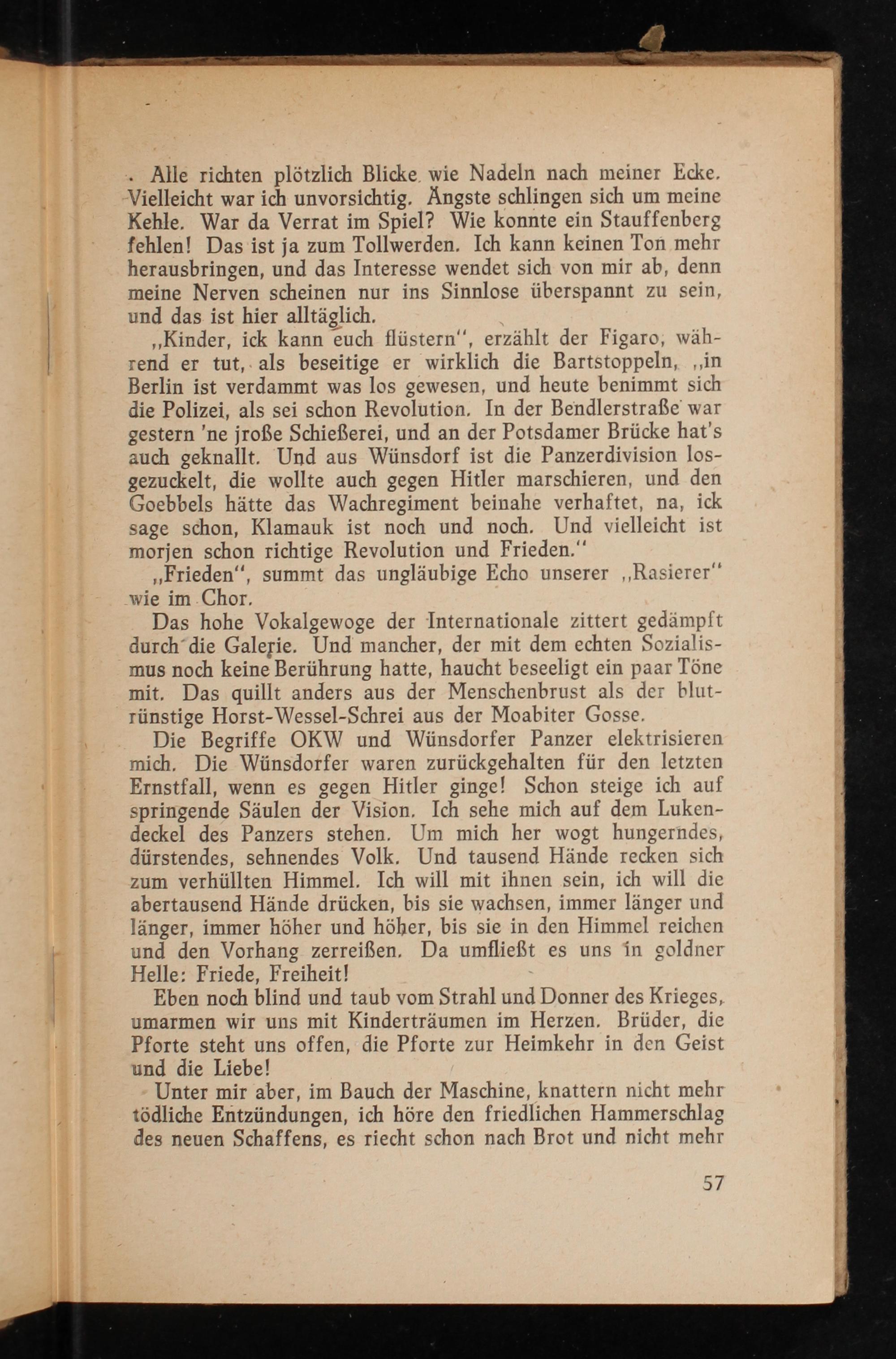 Die Begriffe OKW und Wünsdorfer Panzer elektrisieren mich. Die Wünsdorfer waren zurückgehalten für den letzten Ernstfall, wenn es gegen Hitler ginge! Schon steige ich auf springende Säulen der Vision. Ich sehe mich auf dem Lukendeckel des Panzers stehen. Um mich her wogt hungerndes, dürstendes, sehnendes Volk. Und tausend Hände recken sich zum verhüllten Himmel. Ich will mit ihnen sein, ich will die abertausend Hände drücken, bis sie wachsen, immer länger und länger, immer höher und höher, bis sie in den Himmel reichen und den Vorhang zerreißen. Da umfließt es uns in goldner Helle: Friede, Freiheit!