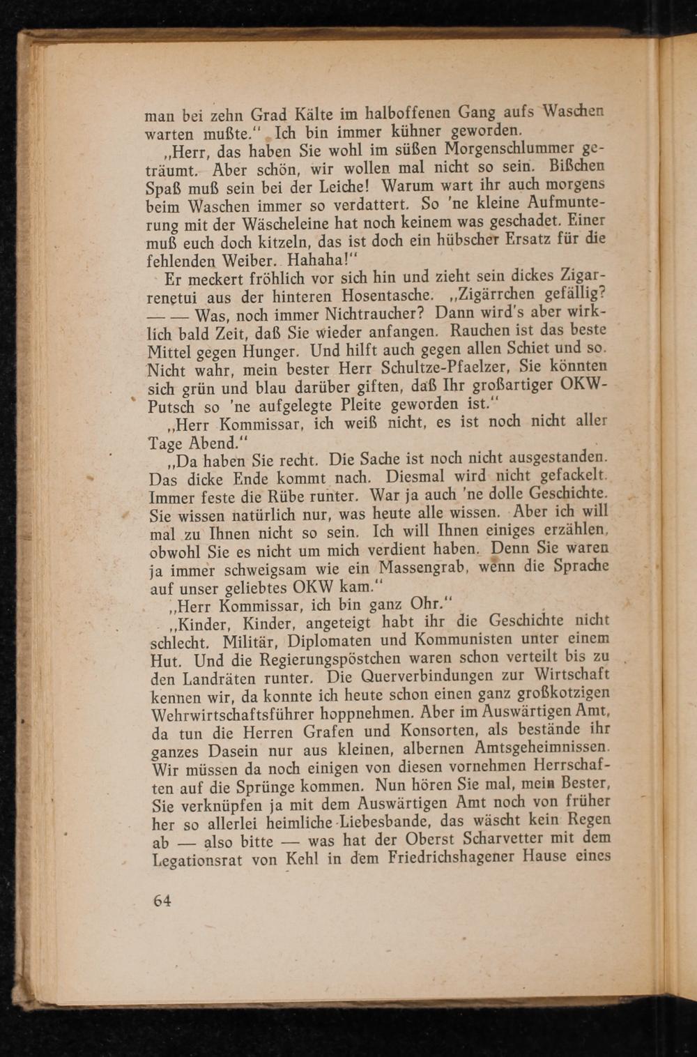 ,, Kinder, Kinder, angeteigt habt ihr die Geschichte nicht schlecht. Militär, Diplomaten und Kommunisten unter einem Hut. Und die Regierungspöstchen waren schon verteilt bis zu den Landräten runter. Die Querverbindungen zur Wirtschaft kennen wir, da konnte ich heute schon einen ganz großkotzigen Wehrwirtschaftsführer hoppnehmen. Aber im Auswärtigen Amt , da tun die Herren Grafen und Konsorten, als bestände ihr ganzes Dasein nur aus kleinen, albernen Amtsgeheimnissen. Wir müssen da noch einigen von diesen vornehmen Herrschaften auf die Sprünge kommen. Nun hören Sie mal, mein Bester, Sie verknüpfen ja mit dem Auswärtigen Amt noch von früher her so allerlei heimliche Liebesbande, das wäscht kein Regen ab also bitte was hat der Oberst Scharvetter mit dem Legationsrat von Kehl in dem Friedrichshagener Hause eines