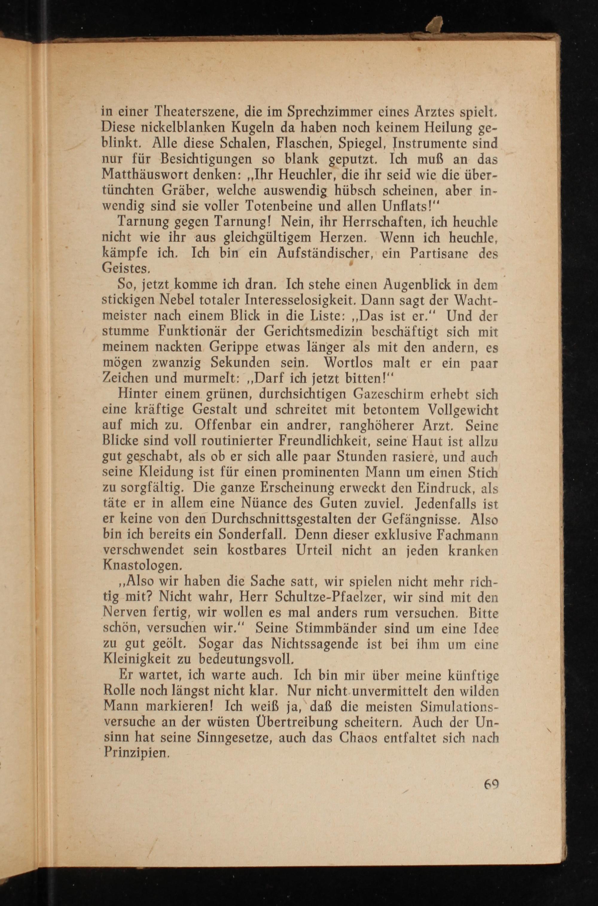 Hinter einem grünen, durchsichtigen Gazeschirm erhebt sich eine kräftige Gestalt und schreitet mit betontem Vollgewicht auf mich zu. Offenbar ein andrer, ranghöherer Arzt. Seine Blicke sind voll routinierter Freundlichkeit, seine Haut ist allzu gut geschabt, als ob er sich alle paar Stunden rasiere, und auch seine Kleidung ist für einen prominenten Mann um einen Stich zu sorgfältig. Die ganze Erscheinung erweckt den Eindruck, als täte er in allem eine Nüance des Guten zuviel. Jedenfalls ist er keine von den Durchschnittsgestalten der Gefängnisse. Also bin ich bereits ein Sonderfall. Denn dieser exklusive Fachmann verschwendet sein kostbares Urteil nicht an jeden kranken Knastologen.
