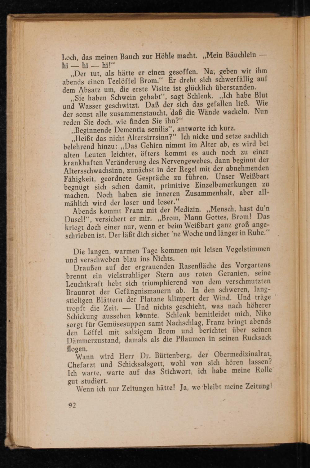 „Der tut, als hätte er einen gesoffen. Na, geben wir ihm abends einen Teelöffel Brom .‘ Er dreht sich schwerfällig auf dem Absatz um, die erste Visite ist glücklich überstanden.