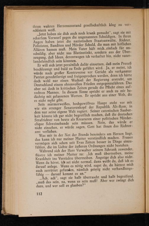 ..Jetzt haben sie dich auch noch krank gemacht", sagt sie mit scharfem Vorwurf gegen die ungenannten Schuldigen. In ihren Augen haben jetzt die nazistischen Staatsanwälte, Richter, Polizisten, Banditen und Mörder Schuld, die man mit höflichen Allüren hassen muß. Mein Vater hält mich einfach für unschuldig, aber nicht aus Blutinstinkt, sondern aus der Überzeugung, daß Ideen, derentwegen ich verhaftet bin, nicht vaterlandsfeindlich sein könnten.
