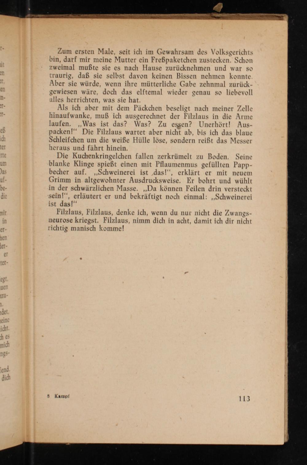 Als ich aber mit dem Päckchen beseligt nach meiner Zelle hinaufwanke, muß ich ausgerechnet der Filzlaus in die Arme laufen.„Was ist das? Was? Zu essen? Unerhört! Aus- packen!‘ Die Filzlaus wartet aber nicht ab, bis ich das blaue Schleifchen um die weiße Hülle löse, sondern reißt das Messer heraus und fährt hinein.