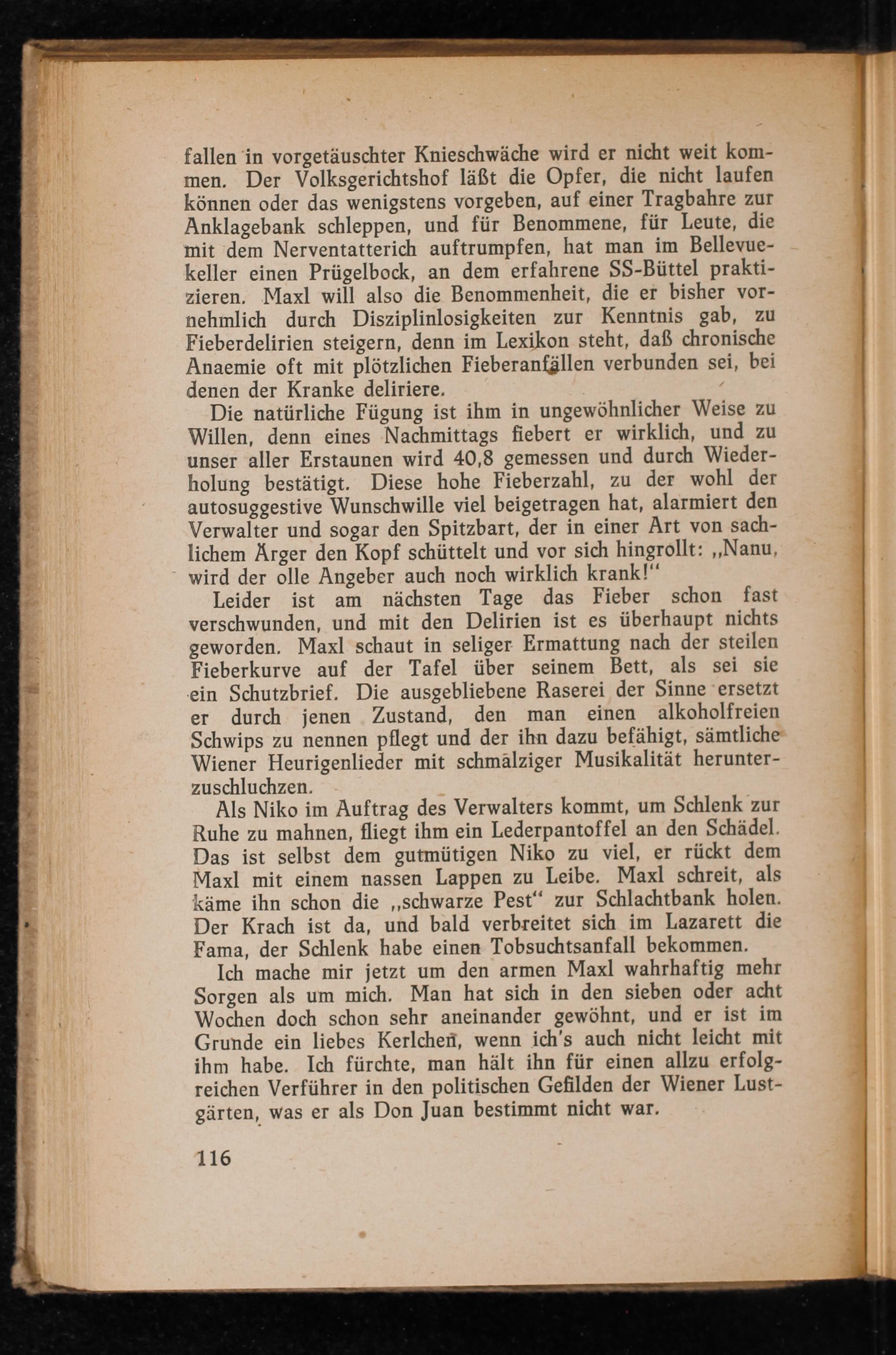 Leider ist am nächsten Tage das Fieber schon fast verschwunden, und mit den Delirien ist es überhaupt nichts geworden. Maxl schaut in seliger Ermattung nach der steilen Fieberkurve auf der Tafel über seinem Bett, als sei sie ein Schutzbrief. Die ausgebliebene Raserei der Sinne ersetzt er durch jenen Zustand, den man einen alkoholfreien Schwips zu nennen pflegt und der ihn dazu befähigt, sämtliche Wiener Heurigenlieder mit schmalziger Musikalität herunterzuschluchzen.