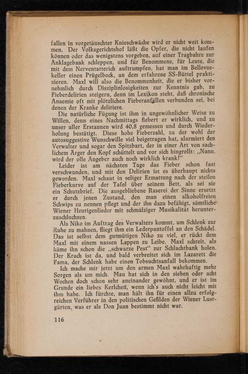 fallen in vorgetäuschter Knieschwäche wird er nicht weit kommen. Der Volksgerichtshof läßt die Opfer, die nicht laufen können oder das wenigstens vorgeben, auf einer Tragbahre zur Anklagebank schleppen, und für Benommene, für Leute, die mit dem Nerventatterich auftrumpfen, hat man im Bellevuekeller einen Prügelbock, an dem erfahrene SS- Büttel praktizieren. Maxl will also die Benommenheit, die er bisher vornehmlich durch Disziplinlosigkeiten zur Kenntnis gab, zu Fieberdelirien steigern, denn im Lexikon steht, daß chronische Anaemie oft mit plötzlichen Fieberanfällen verbunden sei, bei denen der Kranke deliriere.