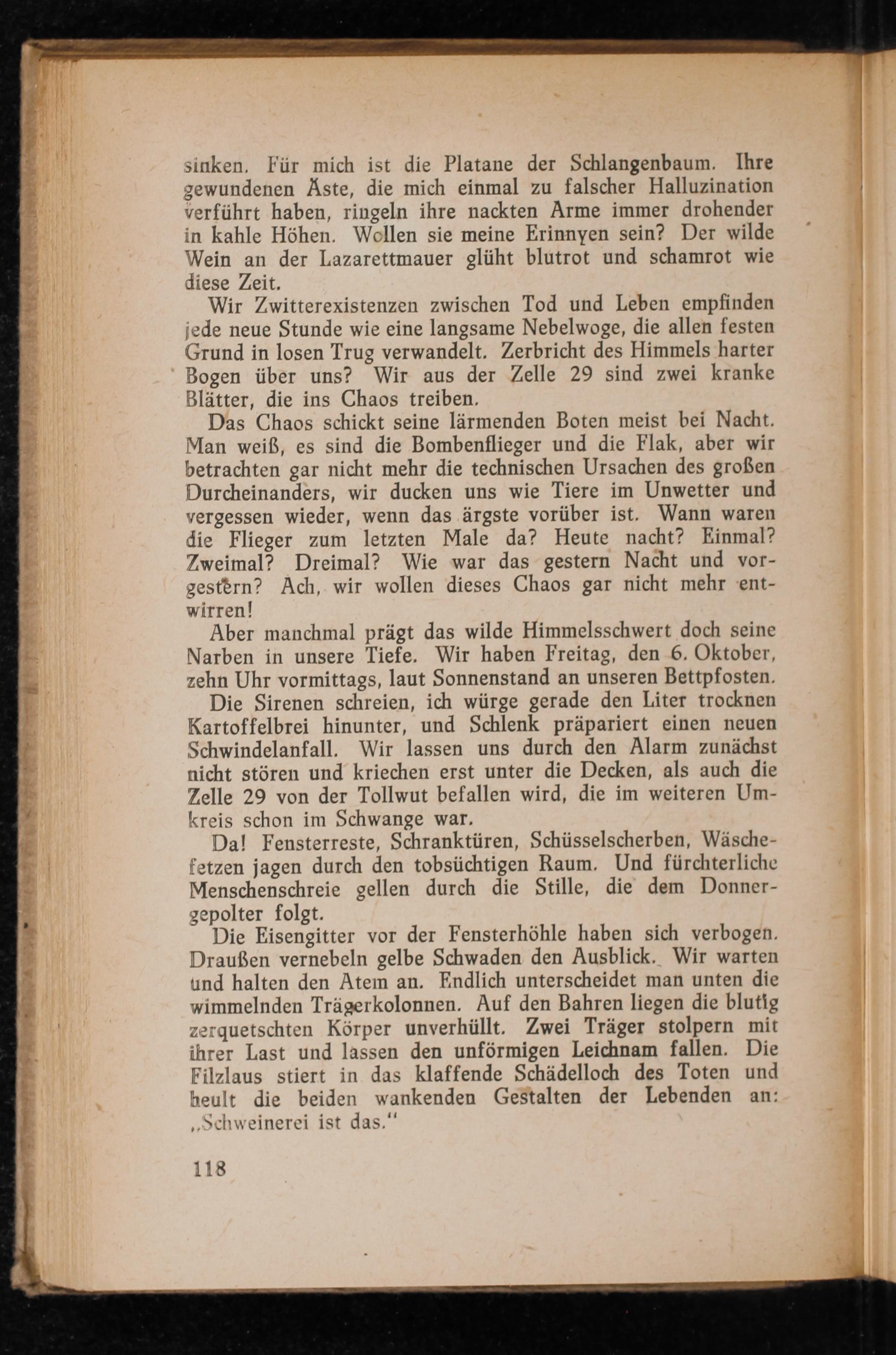 Wir Zwitterexistenzen zwischen Tod und Leben empfinden jede neue Stunde wie eine langsame Nebelwoge, die allen festen Grund in losen Trug verwandelt. Zerbricht des Himmels harter Bogen über uns? Wir aus der Zelle 29 sind zwei kranke Blätter, die ins Chaos treiben.