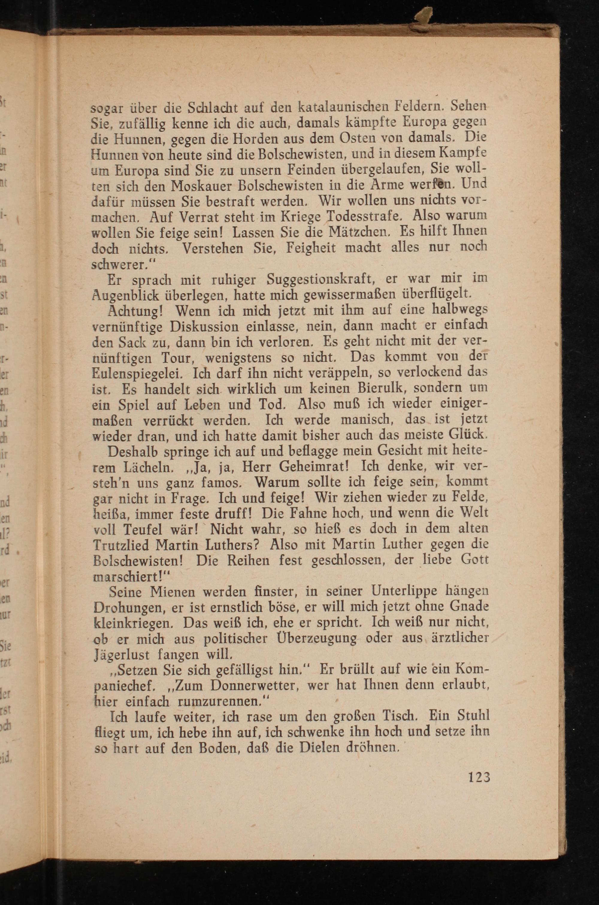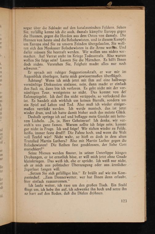 Deshalb springe ich auf und beflagge mein Gesicht mit heite- rem Lächeln. ‚Ja, ja, Herr Geheimrat! Ich denke, wir ver- steh’'n uns ganz famos. Warum sollte ich feige sein, kommt gar nicht in Frage. Ich und feige! Wir ziehen wieder zu Felde, heißa, immer feste druff! Die Fahne hoch, und wenn die Welt voll Teufel wär! Nicht wahr, so hieß es doch in dem alten Trutzlied Martin Luthers? Also mit Martin Luther gegen die Bolschewisten! Die Reihen fest geschlossen, der liebe Gott imarschiert!‘