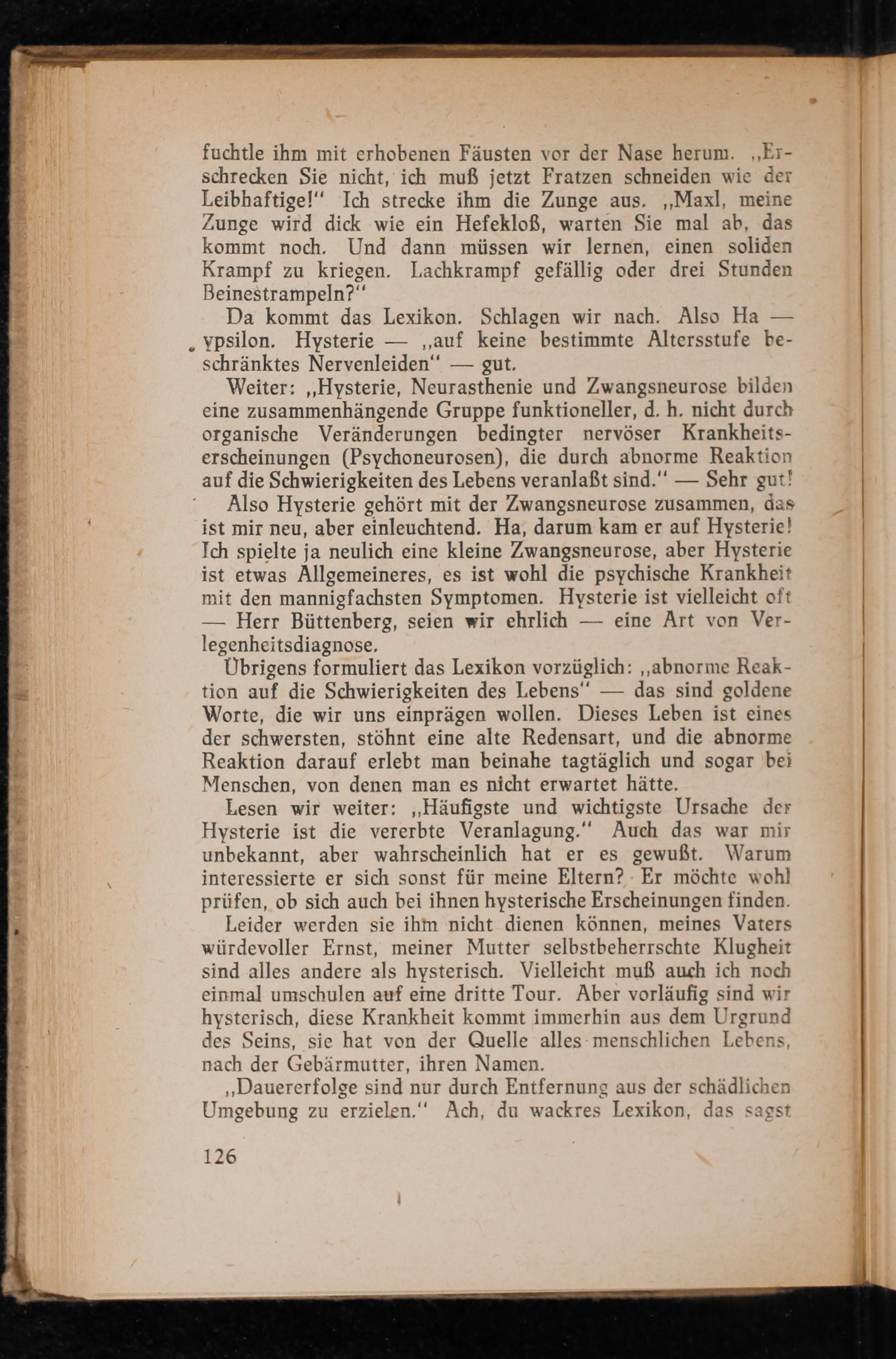 Leider werden sie ihm nicht dienen können, meines Vaters würdevoller Ernst, meiner Mutter selbstbeherrschte Klugheit sind alles andere als hysterisch. Vielleicht muß auch ich noch einmal umschulen auf eine dritte Tour. Aber vorläufig sind wir hysterisch, diese Krankheit kommt immerhin aus dem Urgrund des Seins, sie hat von der Quelle alles menschlichen Lebens, nach der Gebärmutter, ihren Namen.