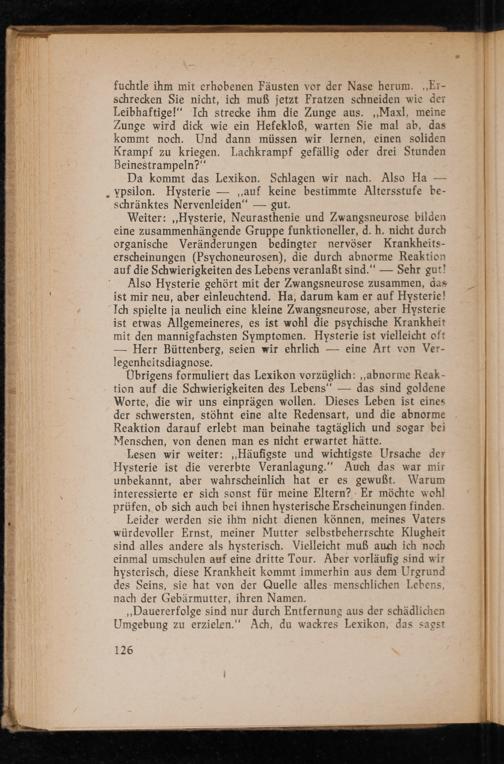 Also Hysterie gehört mit der Zwangsneurose zusammen, das ist mir neu, aber einleuchtend. Ha, darum kam er auf Hysterie! Ich spielte ja neulich eine kleine Zwangsneurose, aber Hysterie ist etwas Allgemeineres, es ist wohl die psychische Krankheit mit den mannigfachsten Symptomen. Hysterie ist vielleicht oft Herr Büttenberg, seien wir ehrlich eine Art von Verlegenheitsdiagnose.