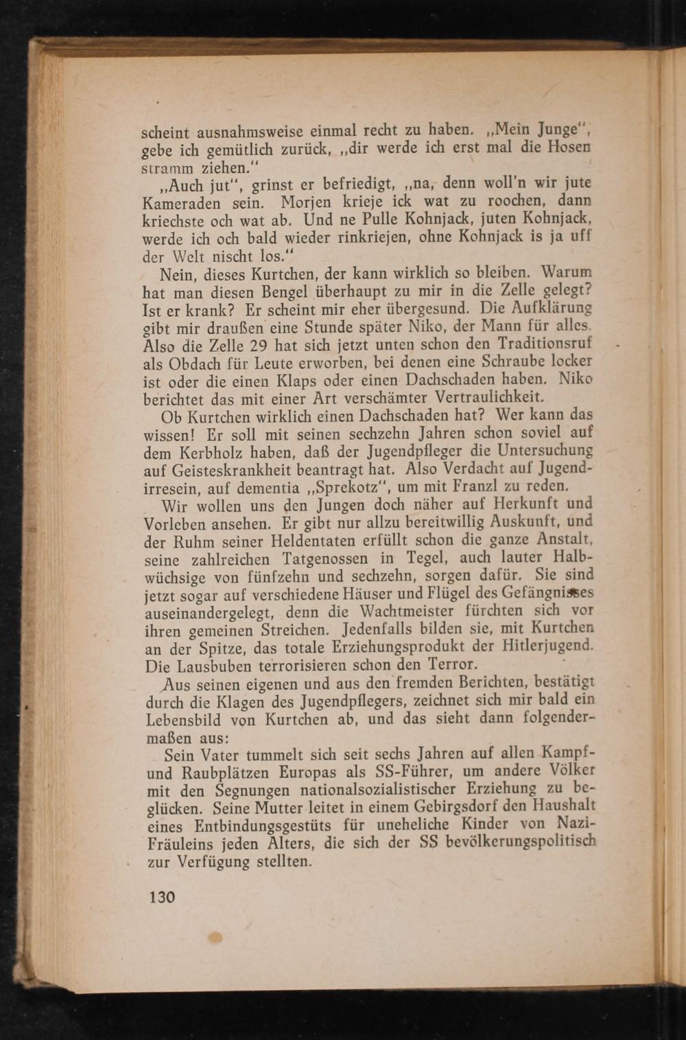 Wir wollen uns den Jungen doch näher auf Herkunft und Vorleben ansehen. Er gibt nur allzu bereitwillig Auskunft, und der Ruhm seiner Heldentaten erfüllt schon die ganze Anstalt, seine zahlreichen Tatgenossen in Tegel , auch lauter Halb- wüchsige von fünfzehn und sechzehn, sorgen dafür. Sie sind jetzt sogar auf verschiedene Häuser und Flügel des Gefängnisses auseinandergelegt, denn die Wachtmeister fürchten sich vor ihren gemeinen Streichen. Jedenfalls bilden sie, mit Kurtchen an der Spitze, das totale Erziehungsprodukt der Hitlerjugend . Die Lausbuben terrorisieren schon den Terror.