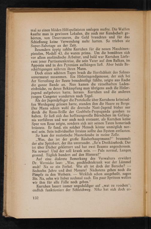 Als der Jugendpfleger die Protokolle über Kurtchens kriminellen Werdegang gelesen hatte, standen ihm die Haare zu Berge. Der Mann schien wohl die deutsche Nazi- Jugend bisher nur durch die Rosa- Brille der Goebbels- Propaganda gesehen zu haben. Er ließ sich das hoffnungsvolle Bürschchen im Gefängnis vorführen und war auch noch erstaunt, als Kurtchen keine Spur von Reue zeigte, sondern sich mit seinen Taten homerisch brüstete. Er fand, ein solcher Mensch könne unmöglich normal sein. Sein individueller Irrsinn sollte das System entlasten. So kam der nazistische Musterknabe in meine Zelle. ,, Was, das ist der große Räuberhauptmann?" brummelt der alte Spitzbart, der ihn untersucht. ,, So'n Dreikäsehoch. Der ist über Dächer geklettert und hat zwei Beamte angeschossen. Na sowas! Und der soll krank sein. Puls normal, Lungen gesund. Täglich hundert auf den Hintern!"