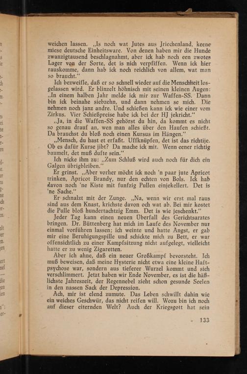 Ich bezweifle, daß er so schnell wieder auf die Menschheit losgelassen wird. Er blinzelt höhnisch mit seinen kleinen Augen: ,, In einem halben Jahr melde ick mir zur Waffen- SS . Dann bin ick beinahe siebzehn, und dann nehmen se mich. Die nehmen noch janz andre. Und schießen kann ick wie einer vom Zirkus. Vier Schießpreise habe ick bei der HJ jekricht."