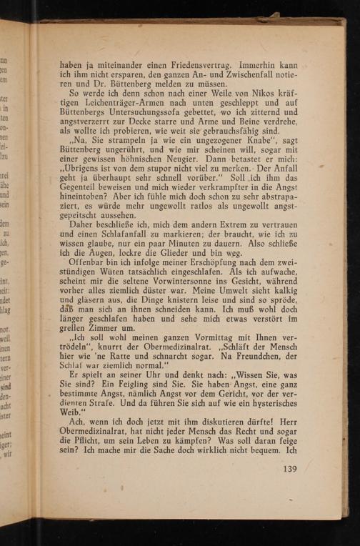 ,, Na, Sie strampeln ja wie ein ungezogener Knabe", sagt Büttenberg ungerührt, und wie mir scheinen will, sogar mit einer gewissen höhnischen Neugier. Dann betastet er mich: ,, Übrigens ist von dem stupor nicht viel zu merken. Der Anfall geht ja überhaupt sehr schnell vorüber." Soll ich ihm das Gegenteil beweisen und mich wieder verkrampfter in die Angst hineintoben? Aber ich fühle mich doch schon zu sehr abstrapaziert, es würde mehr ungewollt ratlos als ungewollt angstgepeitscht aussehen.