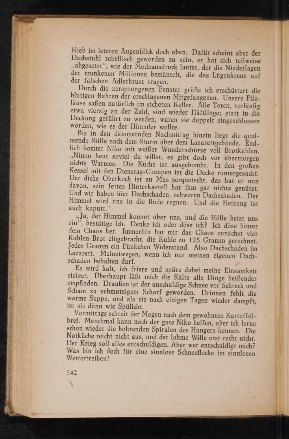 Bis in den dämmernden Nachmittag hinein liegt die qual- mende Stille nach dem Sturm über dem Lazarettgebäude. End- lich kommt Niko mit weißer Wunderschürze voll Brotkuhlen. „Nimm heut soviel du willst, es gibt doch vor übermorgen nichts Warmes. Die Küche ist ausgebombt. In den großen Kessel mit den Dienstag-Graupen ist die Decke runtergesackt. Der dicke Oberkoch ist zu Mus zerquetscht, das hat er nun davon, sein fettes Hinterkastell hat ihm gar nichts genützt. Und wir haben hier Dachschaden, schweren Dachschaden. Der Himmel wird uns in die Bude regnen. Und die Heizung ist auch kaputt.“