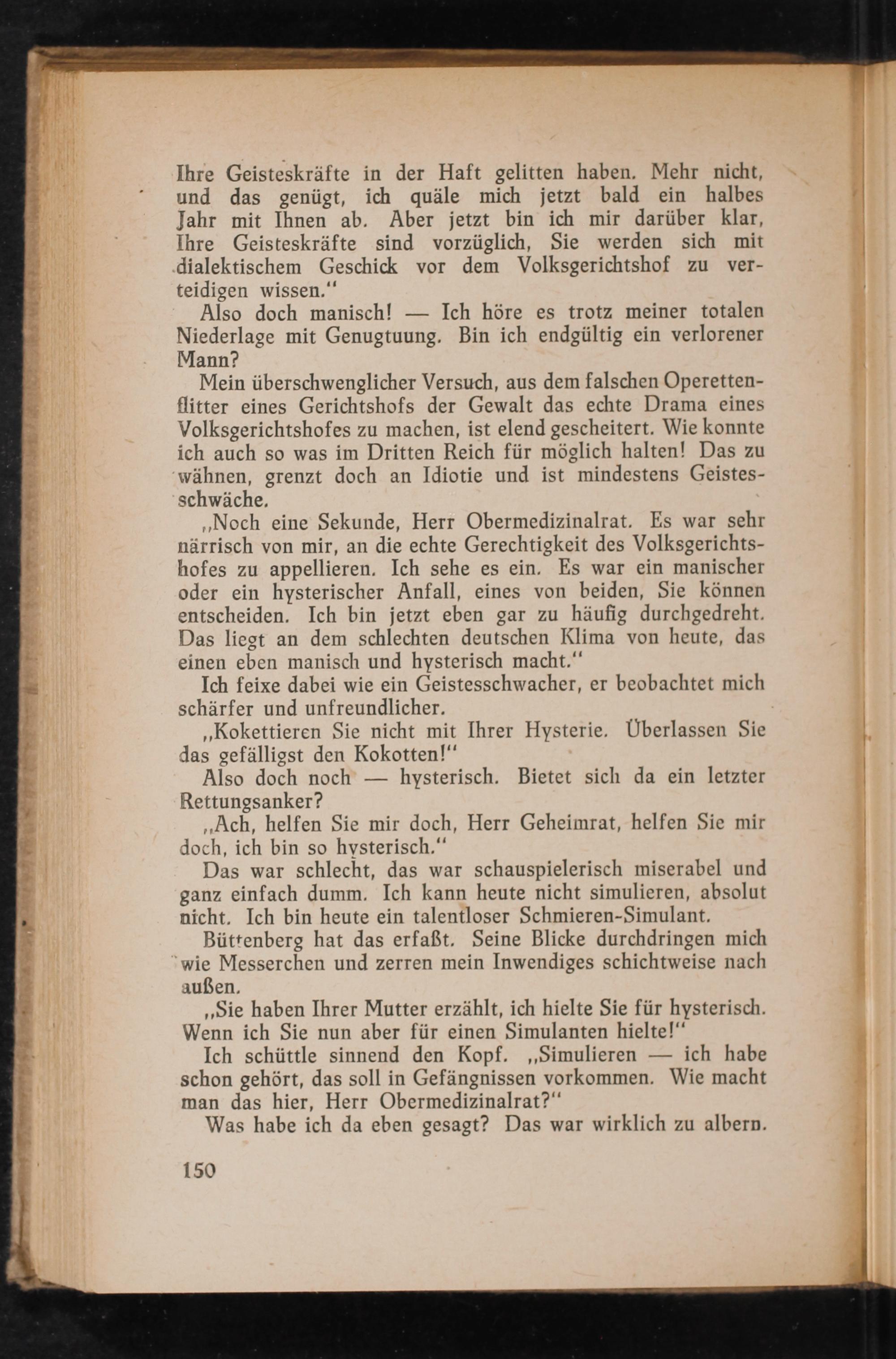 ,, Noch eine Sekunde, Herr Obermedizinalrat. Es war sehr närrisch von mir, an die echte Gerechtigkeit des Volksgerichtshofes zu appellieren. Ich sehe es ein. Es war ein manischer oder ein hysterischer Anfall, eines von beiden, Sie können entscheiden. Ich bin jetzt eben gar zu häufig durchgedreht. Das liegt an dem schlechten deutschen Klima von heute, das einen eben manisch und hysterisch macht."