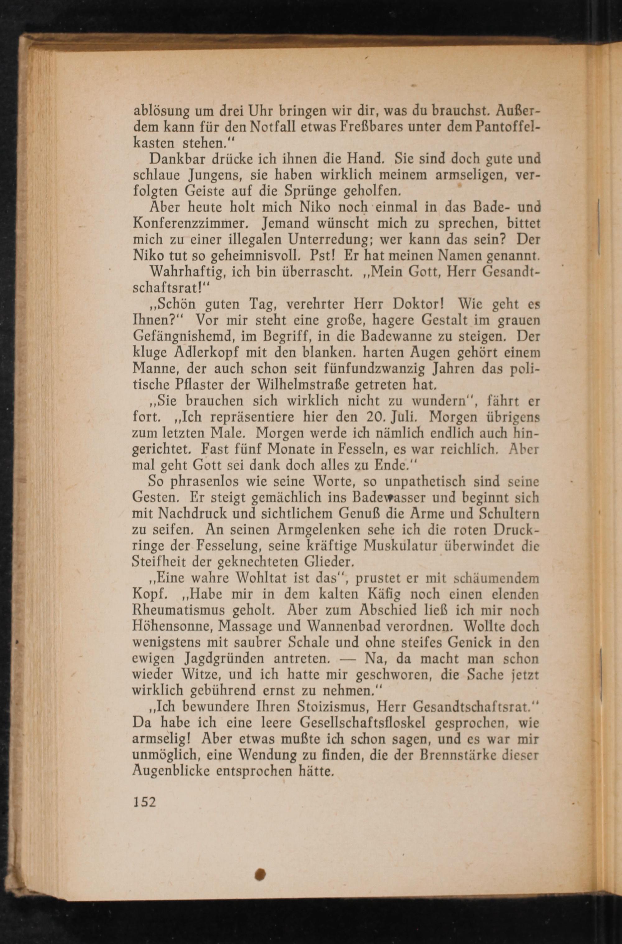 ,, Sie brauchen sich wirklich nicht zu wundern", fährt er fort. ,, Ich repräsentiere hier den 20. Juli. Morgen übrigens zum letzten Male. Morgen werde ich nämlich endlich auch hingerichtet. Fast fünf Monate in Fesseln, es war reichlich. Aber mal geht Gott sei dank doch alles zu Ende."